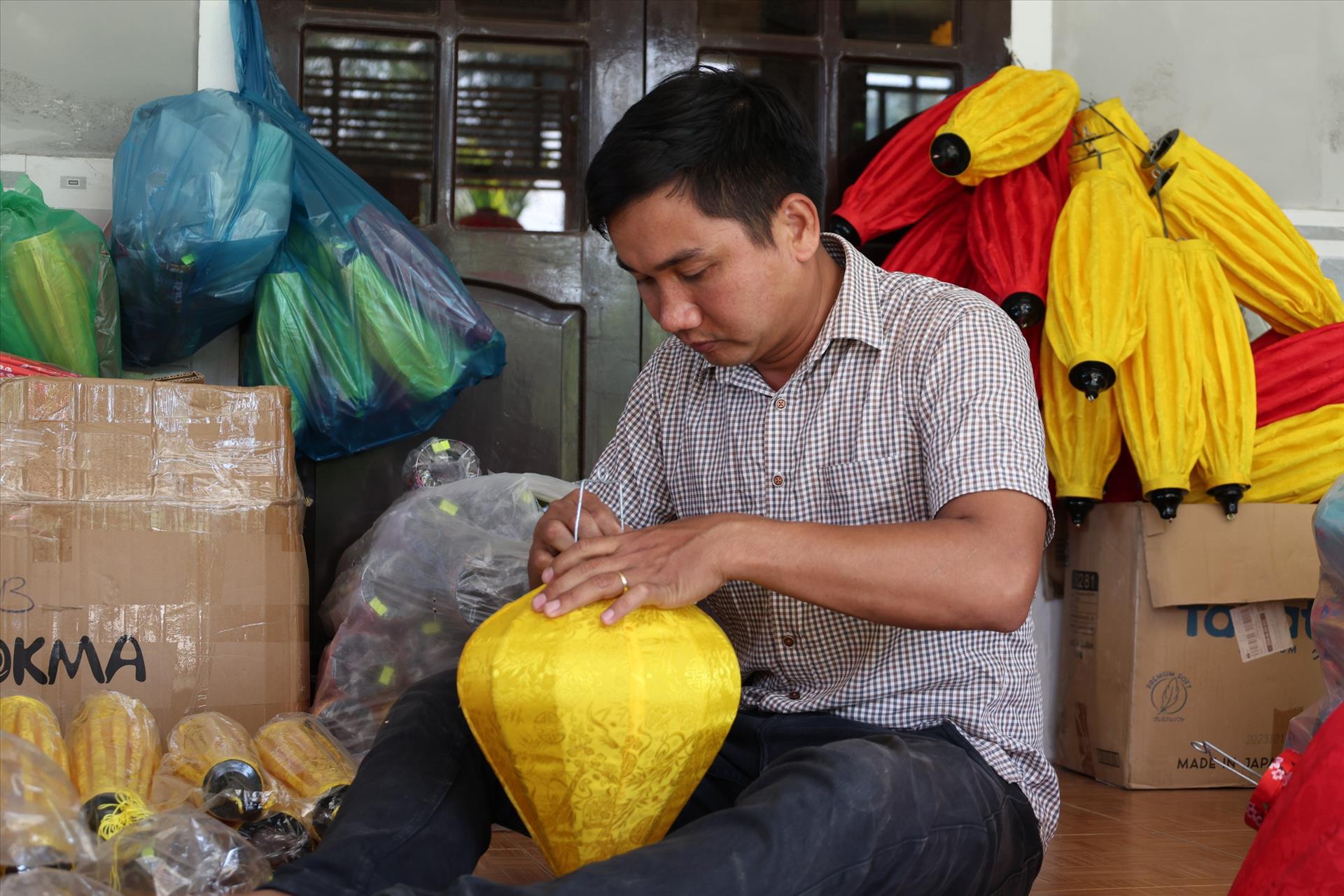 Anh Lê Vĩnh Hà (phường Điện Bàn, thành phố Đà Nẵng) đóng gói sản phẩm lồng đèn truyền thống cho nhà hàng, cơ sở, khách sạn tại Hội An. Ảnh: Khoa Chương - TTXVN
