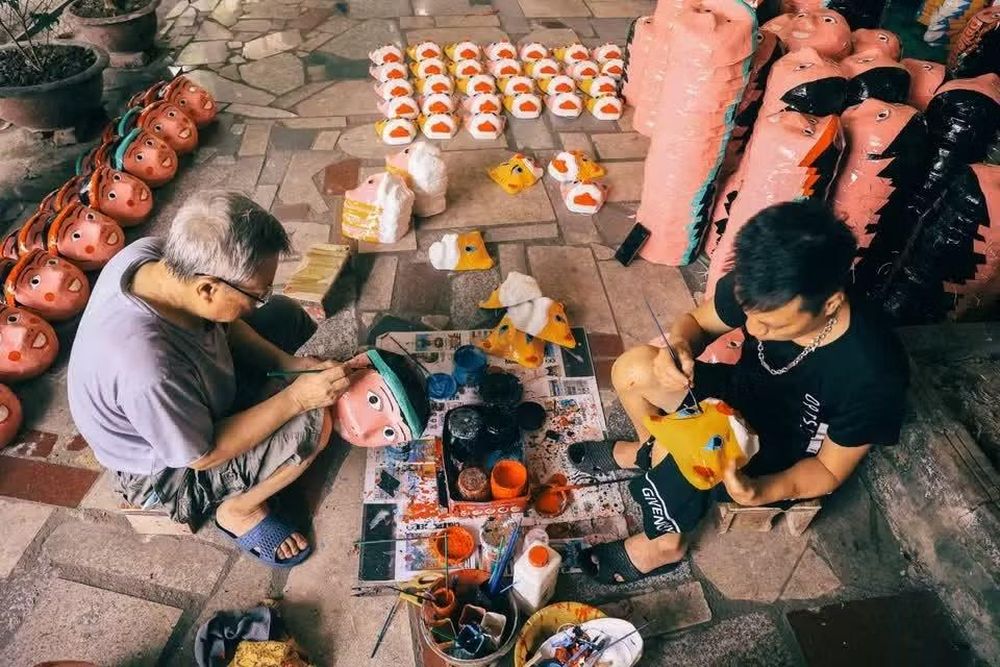 Gia đình ông Vũ Huy Đông thuộc làng Ông Hảo (xã Liêu Xá, huyện Yên Mỹ, Hưng Yên) vẫn lưu giữ nghề làm mặt nạ giấy bồi Trung Thu truyền thống hơn 40 năm nay. Ảnh: Hoài Nam/Vietnam+
