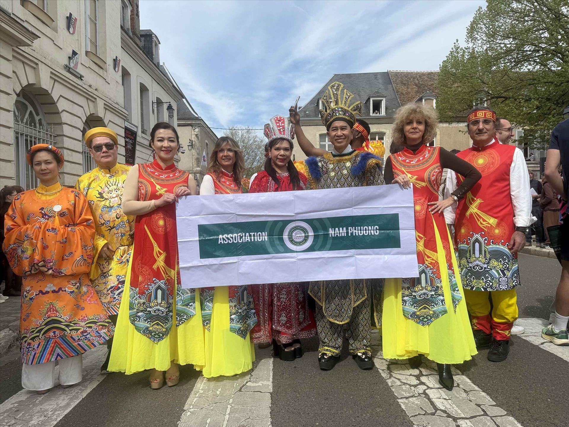 Hội Nam Phương tham gia lễ hội với màn trình diễn trang phục truyền thống Việt Nam, tái hiện hình tượng Âu Cơ – Lạc Long Quân và giới thiệu các thiết kế lấy cảm hứng từ trang phục cung đình Huế. Ảnh: Hữu Chiến - P/v TTXVN tại Pháp
