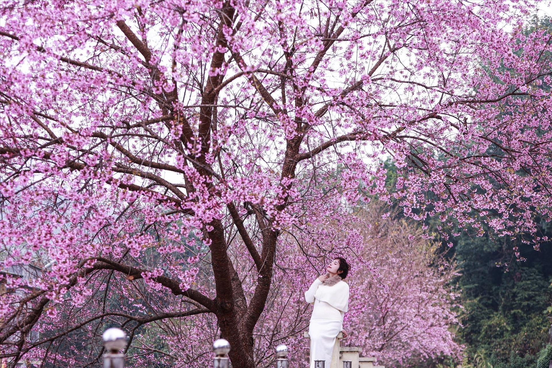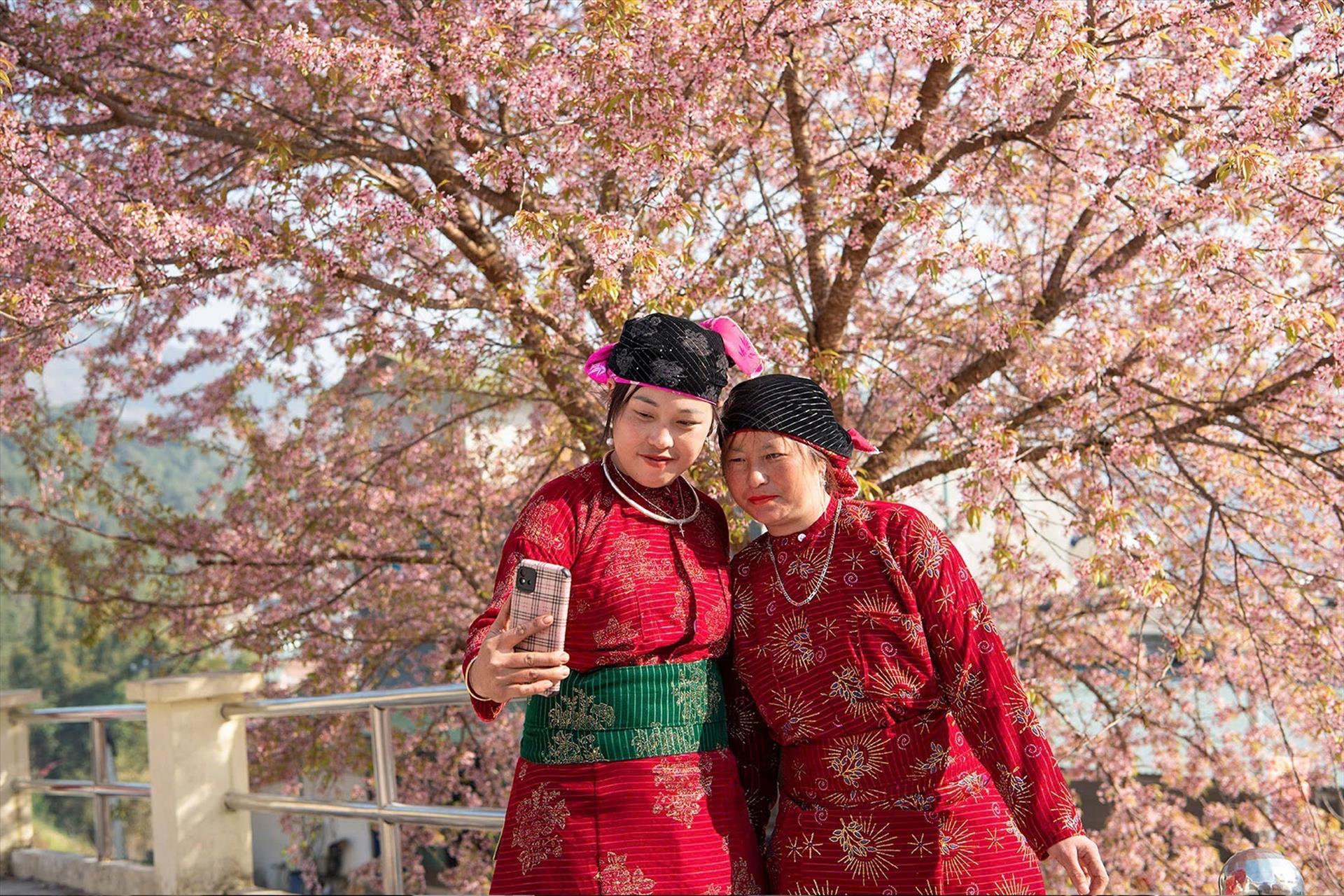 Du khách ghi lại khoảnh khắc xuân về bên hoa mai anh đào ở xã Lũng Cú, tỉnh Tuyên Quang.
