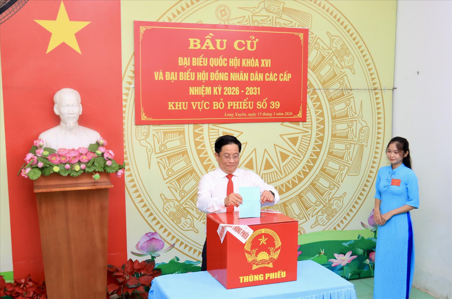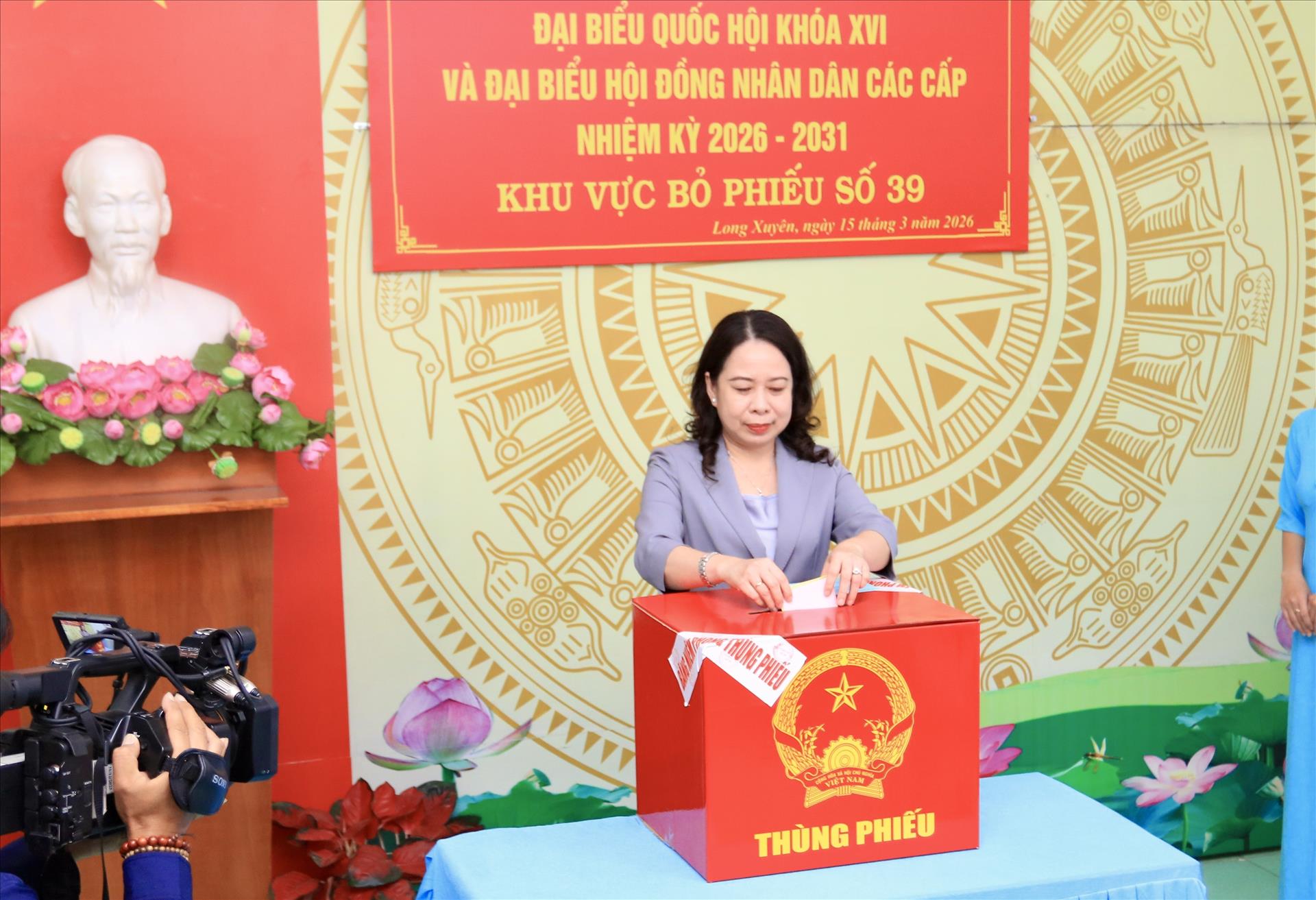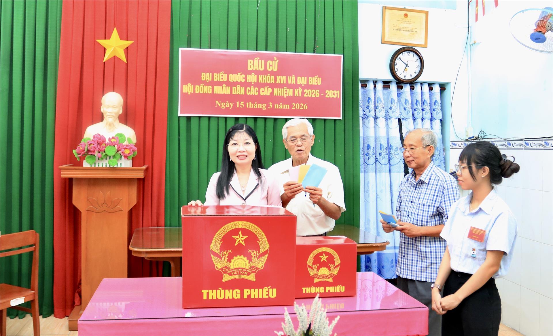 Cũng trong sáng nay, đồng chí Võ Thị Ánh Xuân, Bí thư Trung ương Đảng, Phó Chủ tịch nước, Phó Chủ tịch Hội đồng Bầu cử Quốc gia đã tham gia bỏ phiếu bầu cử đại biểu Quốc hội Việt Nam khóa XVI và đại biểu Hội đồng nhân dân các cấp nhiệm kỳ 2026 - 2031 tại điểm bầu cử số 39, khóm Đông An 2, phường Long Xuyên, tỉnh An Giang.