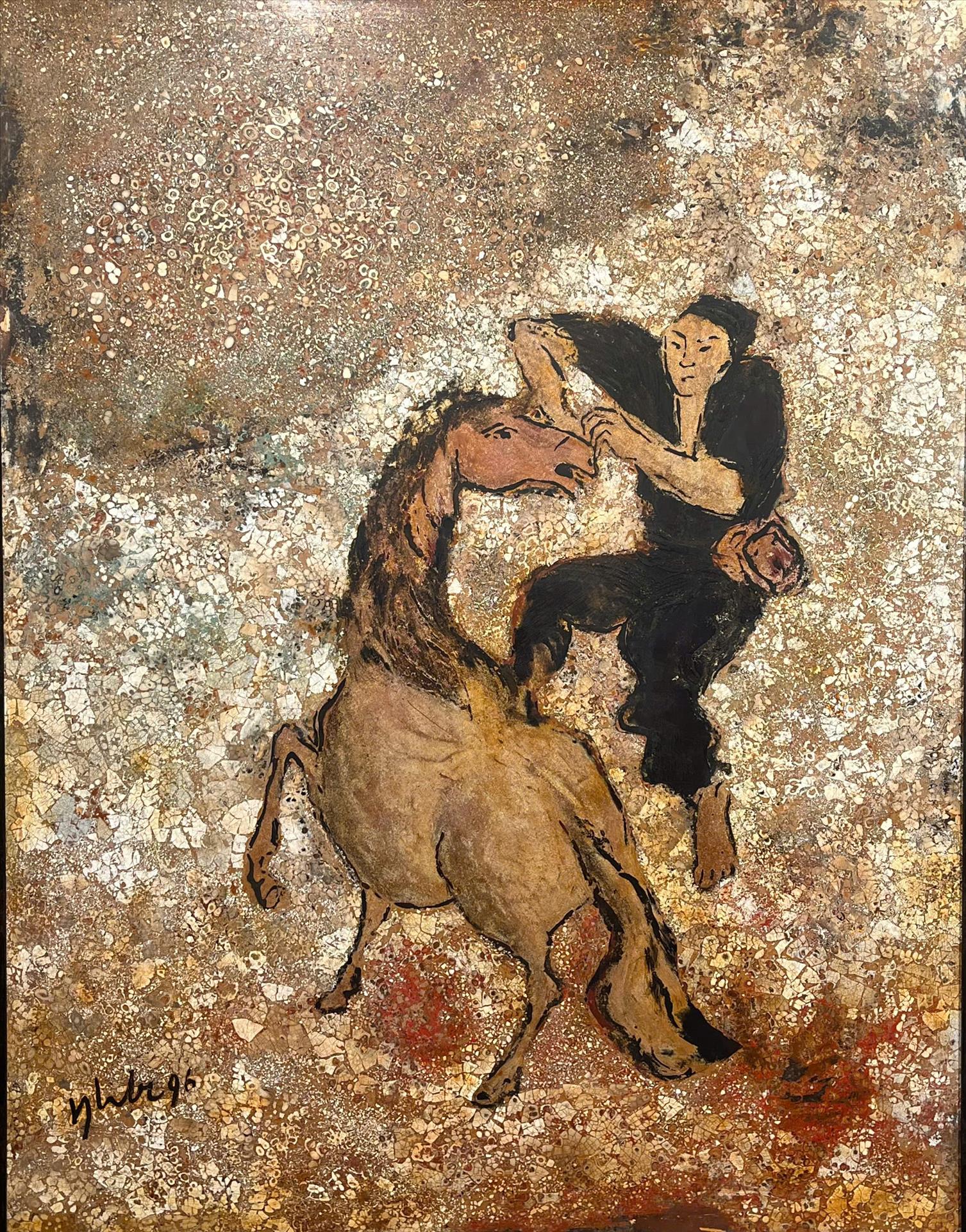 Hoặc ở bức Chọn ngựa, không gian tranh được đẩy về trạng thái gần như trừu tượng, làm nổi bật mối quan hệ trực diện giữa người và ngựa, gợi cảm giác vừa đối kháng vừa hòa quyện. Việc sử dụng vỏ trứng ở nhiều mảng tạo nên hiệu ứng thị giác khiến hình và nền như tan vào nhau, xóa nhòa ranh giới chủ thể - đối tượng. Bởi vậy, hành động "chọn" ở đây không còn mang nghĩa thông thường, mà trở thành một khoảnh khắc gặp gỡ giữa 2 sinh thể dường như có sự giao cảm.
