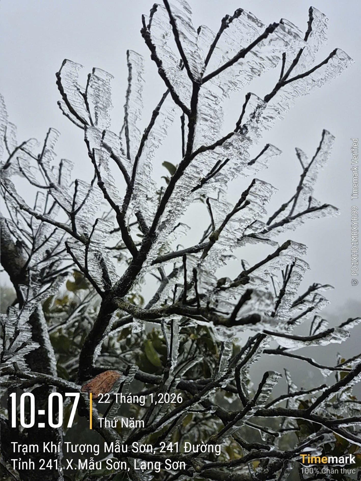 Sáng 22/1/2026, nhiệt độ tại Mẫu Sơn, tỉnh Lạng Sơn đo được ở mức 0.2 độ C và đã bắt đầu xuất hiện hiện tượng băng giá. Ảnh: TTXVN phát