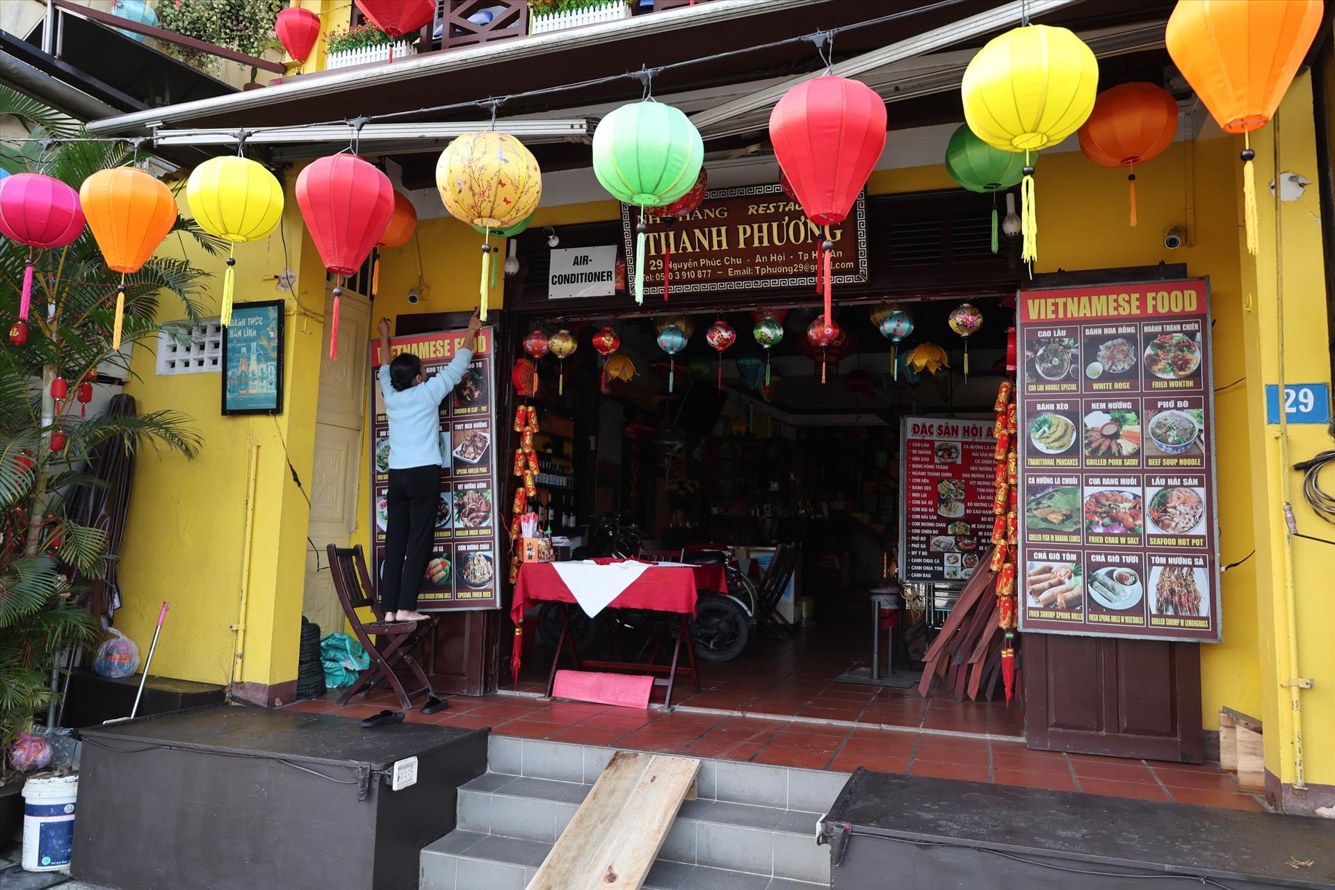 Chủ cửa hàng treo lại bảng hiệu để chuẩn bị cho một ngày mới phục vụ du khách. Ảnh: Xuân Quý/TTXVN