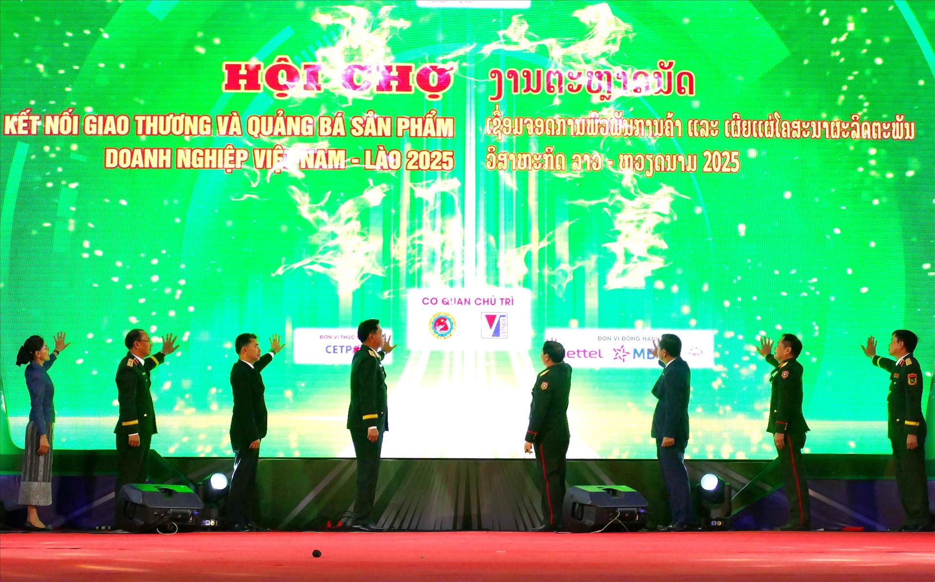 Các đại biểu hai nước Việt Nam - Lào nhấn nút khai mạc Hội chợ. Ảnh: Xuân Tú - PV TTXVN tại Lào