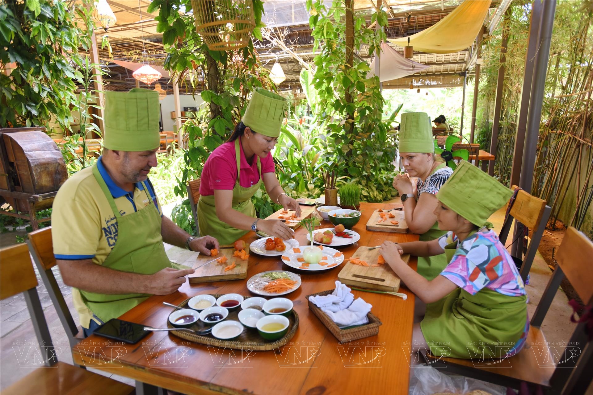 Một gia đình du khách người Đức tham gia lớp học nấu ăn ở làng rau Trà Quế. Ảnh: Thanh Hòa/Báo ảnh Việt Nam