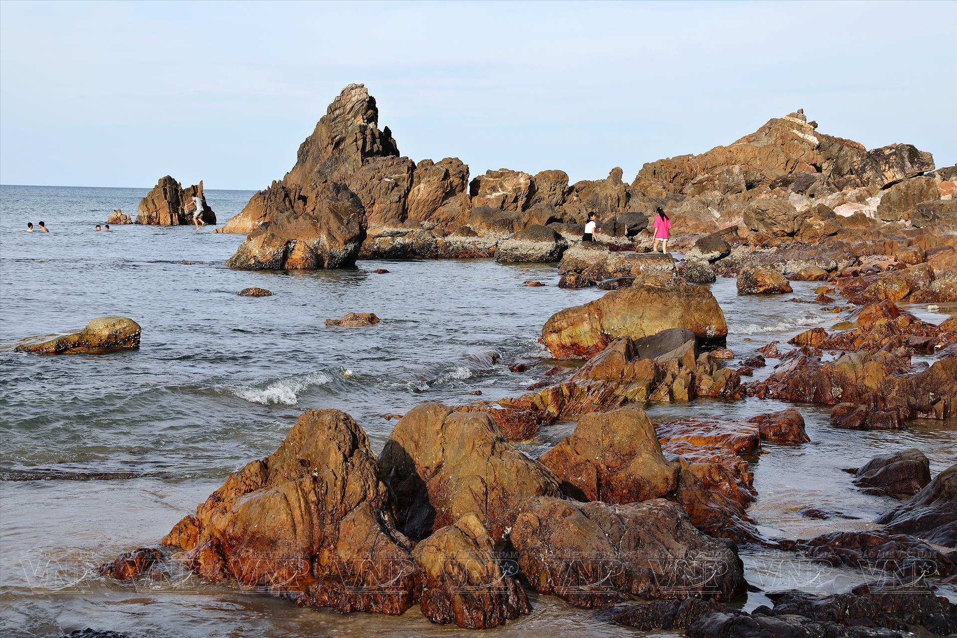 Nước biển ở bãi Đá Nhảy khá nông nên du khách có thể lội bộ theo dọc bờ biển.