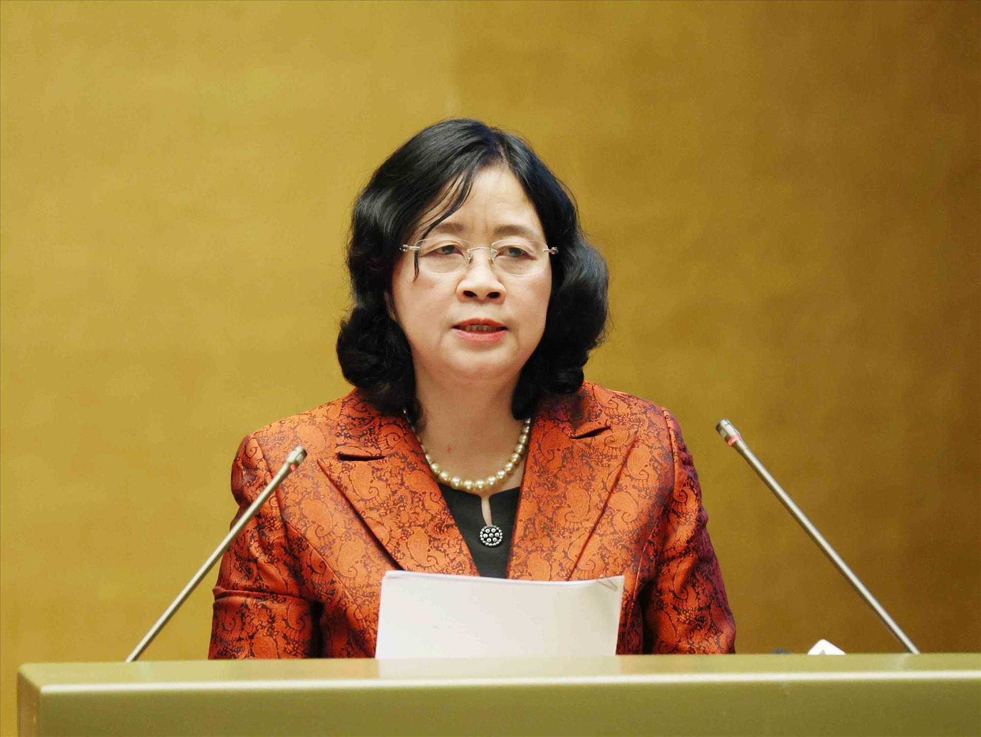 Đồng chí Bùi Thị Minh Hoài, Uỷ viên Bộ Chính trị, Bí thư Trung ương Đảng, Chủ tịch Uỷ ban Trung ương Mặt trận Tổ quốc Việt Nam giới thiệu Chuyên đề: "Phát huy sức mạnh Đại đoàn kết toàn dân tộc trong sự nghiệp xây dựng, phát triển đất nước và bảo vệ Tổ quốc trong Kỷ nguyên mới". Ảnh: Phương Hoa - TTXVN