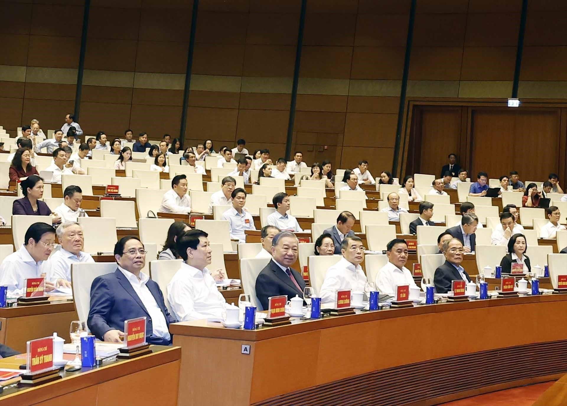 Tổng Bí thư, Chủ tịch nước Tô Lâm cùng các đồng chí lãnh đạo, Đảng, Nhà nước và đại biểu tham dự Hội nghị tại điểm cầu chính Hội trường Diên Hồng, Nhà Quốc hội. Ảnh: Thống Nhất - TTXVN