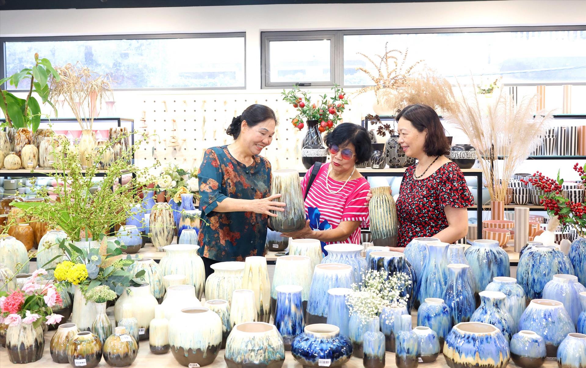 Nghệ nhân Hà Thị Vinh (bên trái) giới thiệu sản phẩm gốm sứ (Bát Tràng) với khách hàng. Ảnh: Phương Hoa - TTXVN