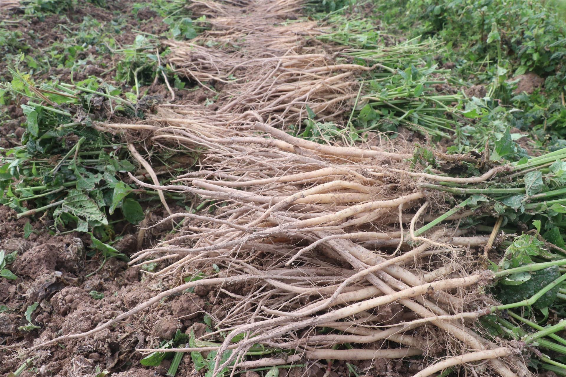 Củ ngưu tất sau khi thu hoạch, rửa sạch, phơi khô hay sấy khô để làm vị thuốc. Ảnh: Đinh Văn Nhiều/TTXVN