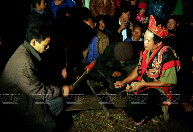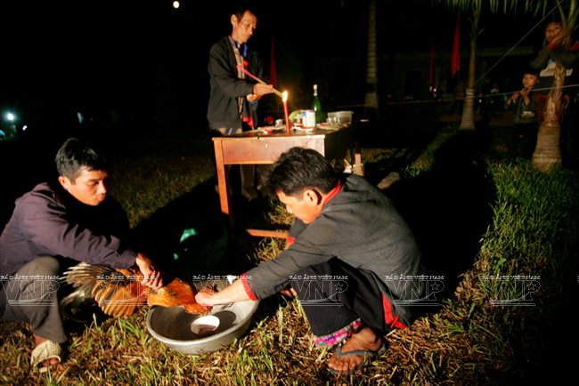 Người dân Pà Thẻn, huyện Quang Bình, Hà Giang đang cắt tiết gà để chuẩn bị cho việc cúng tế nhảy trước lễ hội nhảy lửa.