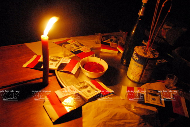 Những lễ vật trên bàn cúng tế bao gồm: 1 bát hương, 1 chiếc đàn sắt, 1 con gà, 10 chén rượu và 1 xấp tiền giấy.