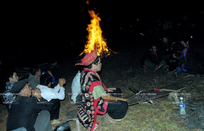 Bắt đầu Lễ hội nhảy lửa, thầy mo Sình Văn Phong làm lễ cầu thần linh. Lễ vật cúng tế bao gồm: 1 chiếc đàn sắt, 1 con gà, 10 chén rượu và 1 xấp tiền giấy.