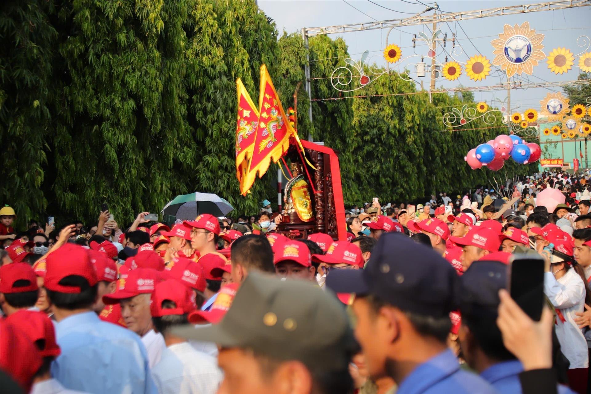 Lễ rước kiệu Bà thu hút hàng ngàn người dân tham gia diễn ra từ 15 giờ đến 19 giờ, đi qua nhiều tuyến đường trung tâm phường Thủ Dầu Một. Ảnh: Huyền Trang - TTXVN
