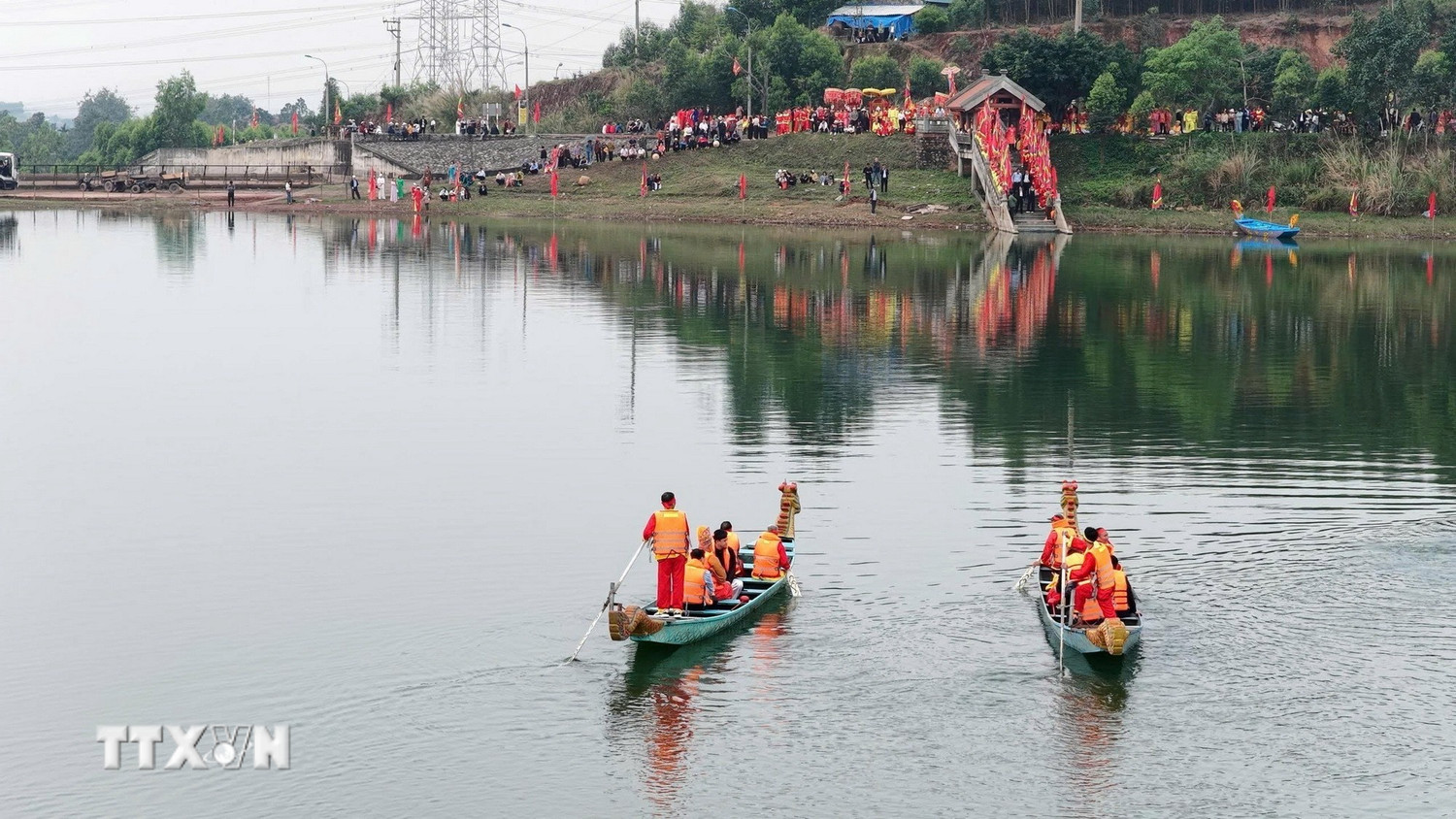 Đoàn thuyền rước nước từ hồ Trại Lốc tiến về bến sông trước cửa Thái Miếu, tái hiện truyền thống "vạn chài" và lòng tri ân nguồn cội của dòng tộc nhà Trần trong ngày khai hội. Ảnh: Thanh Vân/TTXVN