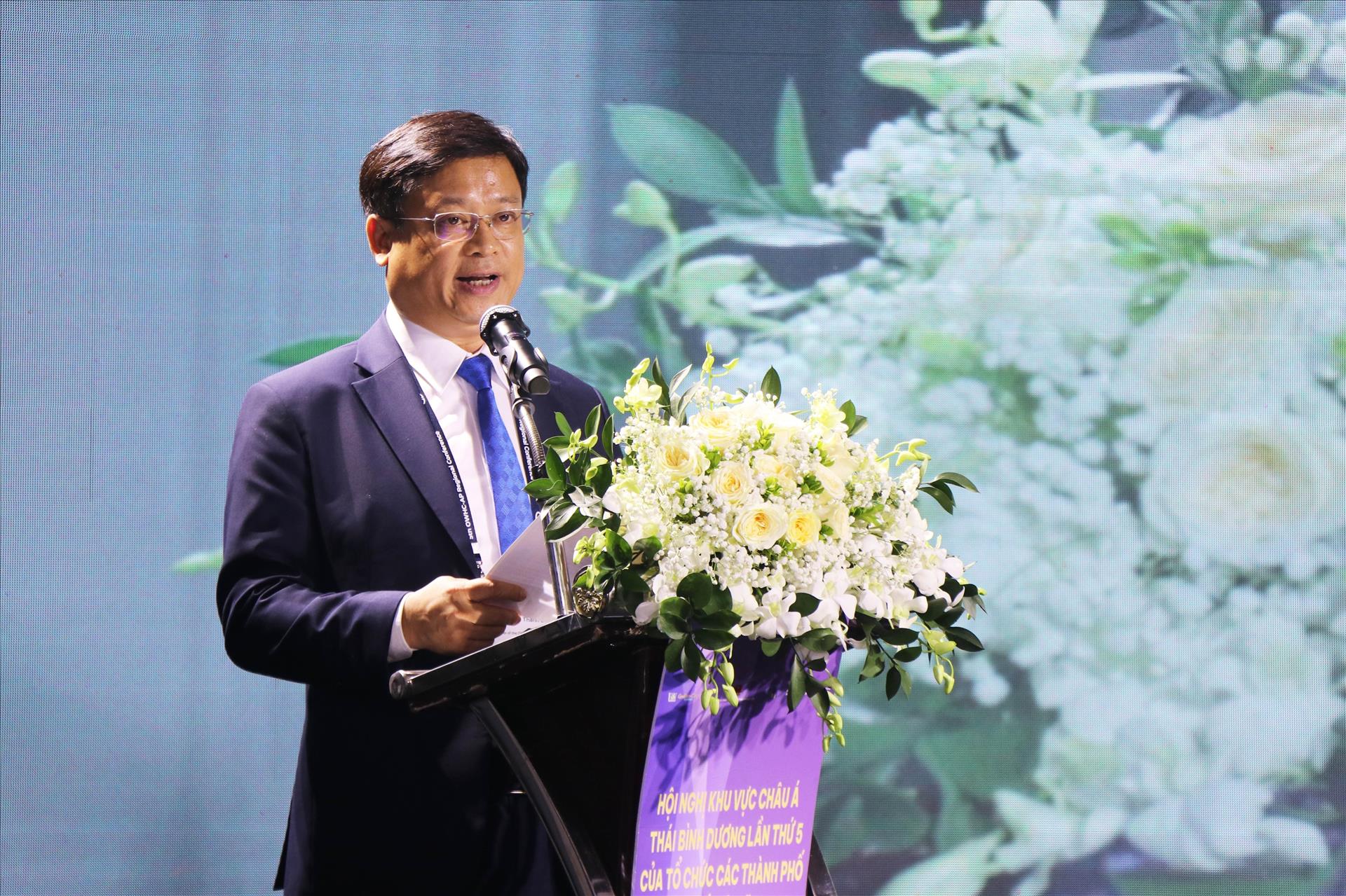 Phó Chủ tịch Thường trực UBND thành phố Huế Nguyễn Thanh Bình phát biểu khai mạc hội nghị. Ảnh: Nguyên Lý - TTXVN