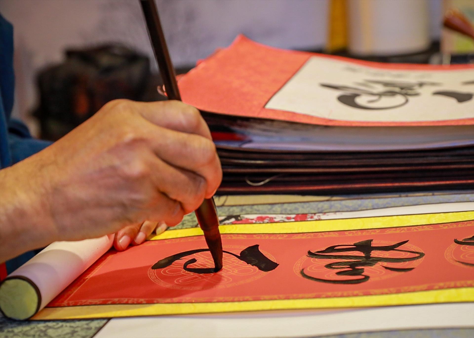 Điểm nhấn xuyên suốt của Hội chữ Xuân Bính Ngọ 2026 là hoạt động xin chữ đầu năm tại 35 gian lều thư pháp. Ảnh: Khánh Hoà - TTXVN
