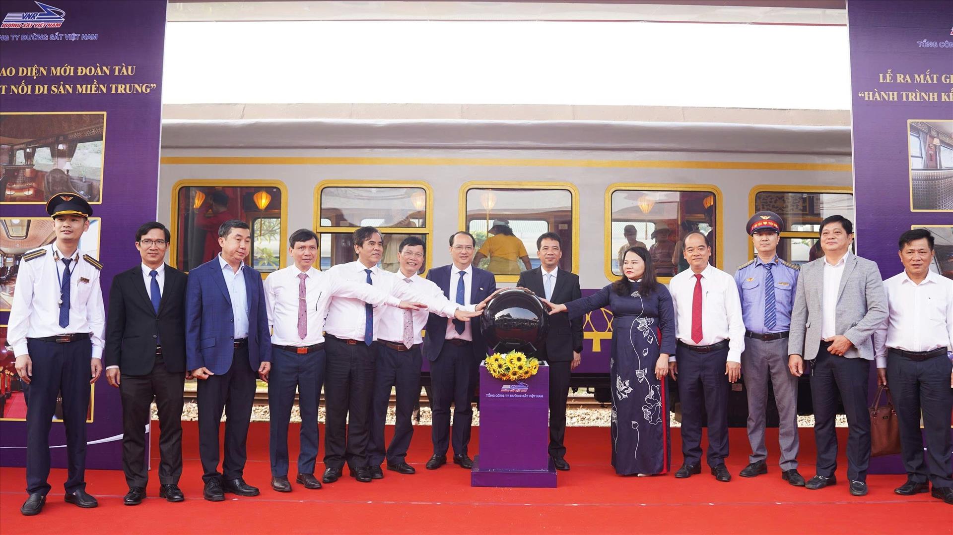Lãnh đạo ngành đường sắt Việt Nam và TP Huế ấn nút vận hành giao diện mới của đoàn tàu "Hành trình kết nối di sản miền Trung". Ảnh: Nguyên Lý - TTXVN