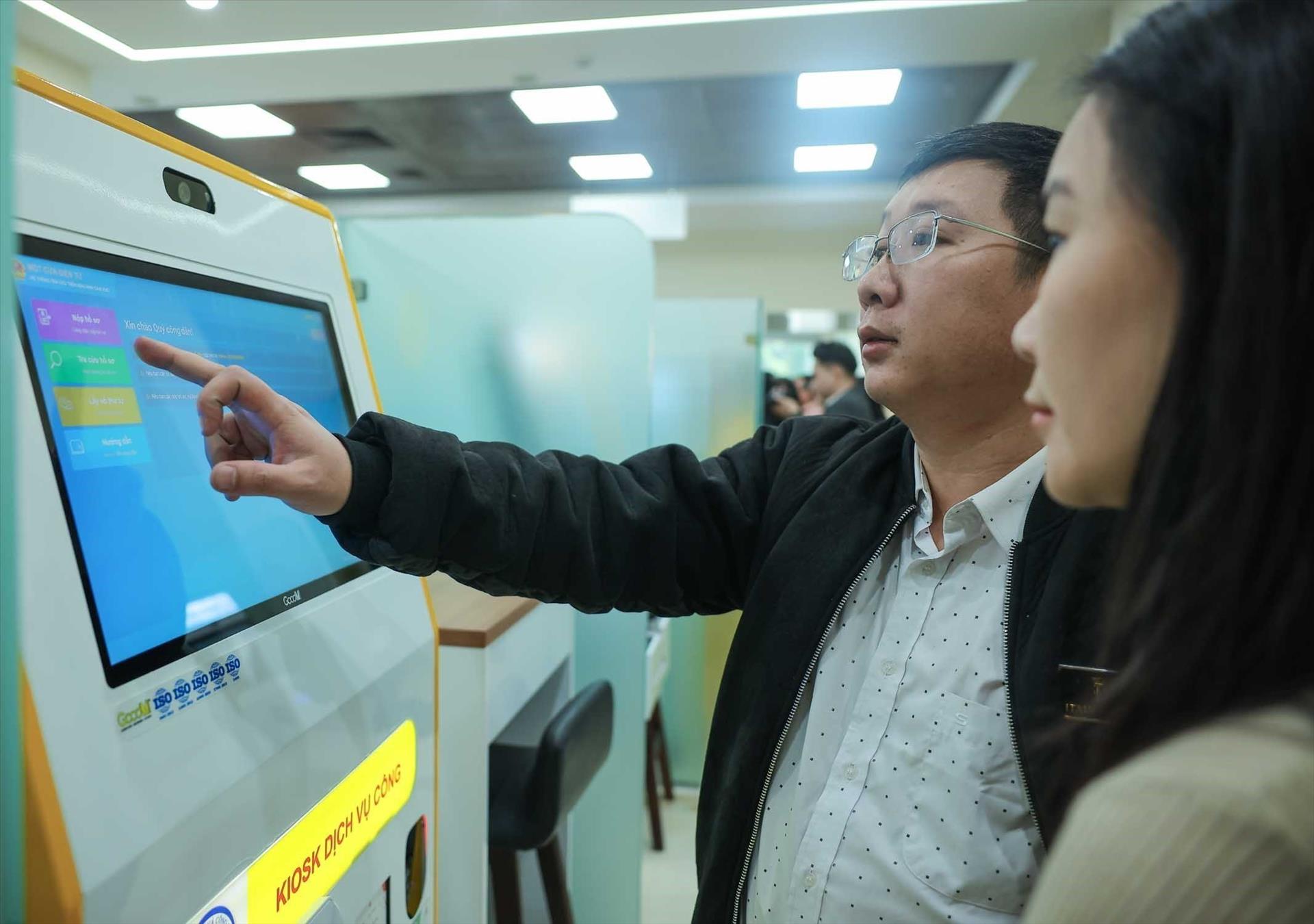 Người dân làm thủ tục tại kiosk dịch vụ công - “Bộ phận tiếp nhận và trả kết quả Bộ Khoa học và Công nghệ”. Ảnh: Hoàng Hiếu - TTXVN