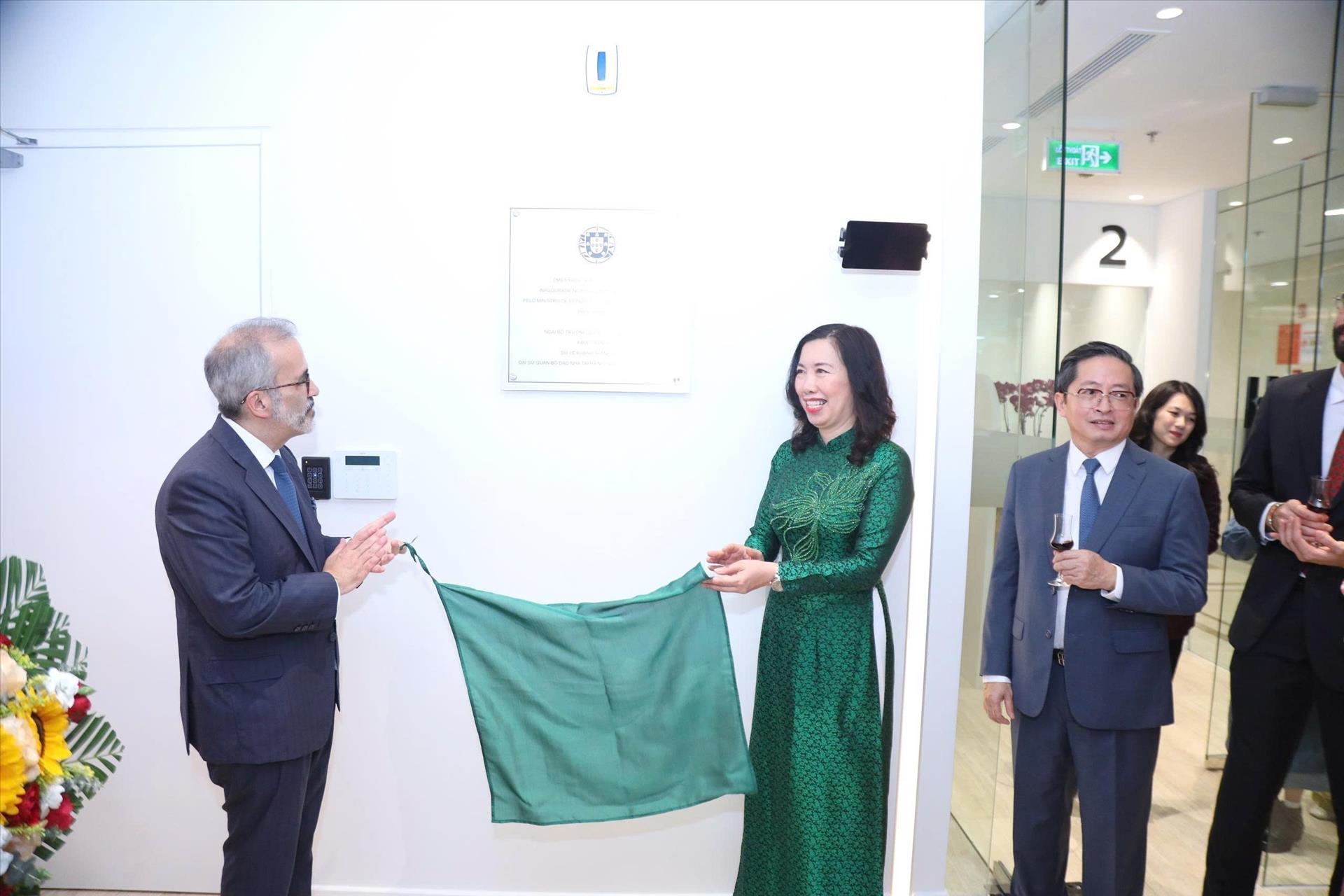 Bộ trưởng Quốc vụ, Bộ trưởng Ngoại giao Bồ Đào Nha Paulo Rangel và Thứ trưởng Bộ Ngoại giao Lê Thị Thu Hằng gỡ băng khánh thành Đại sứ quán Bồ Đào Nha tại Hà Nội. Ảnh: TTXVN phát.