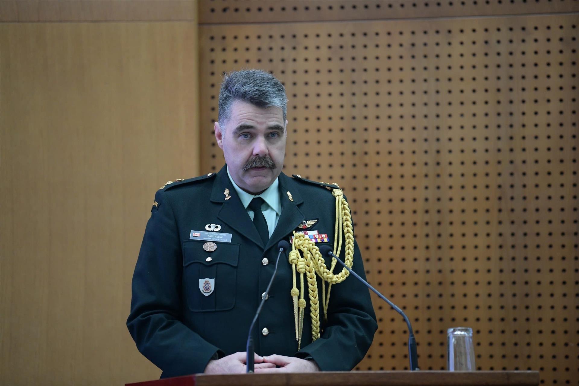 Trung tá Paul Payne, Tùy viên Quốc phòng Canada tại Việt Nam phát biểu tại lễ khai mạc. Ảnh: Hiền Hạnh - TTXVN