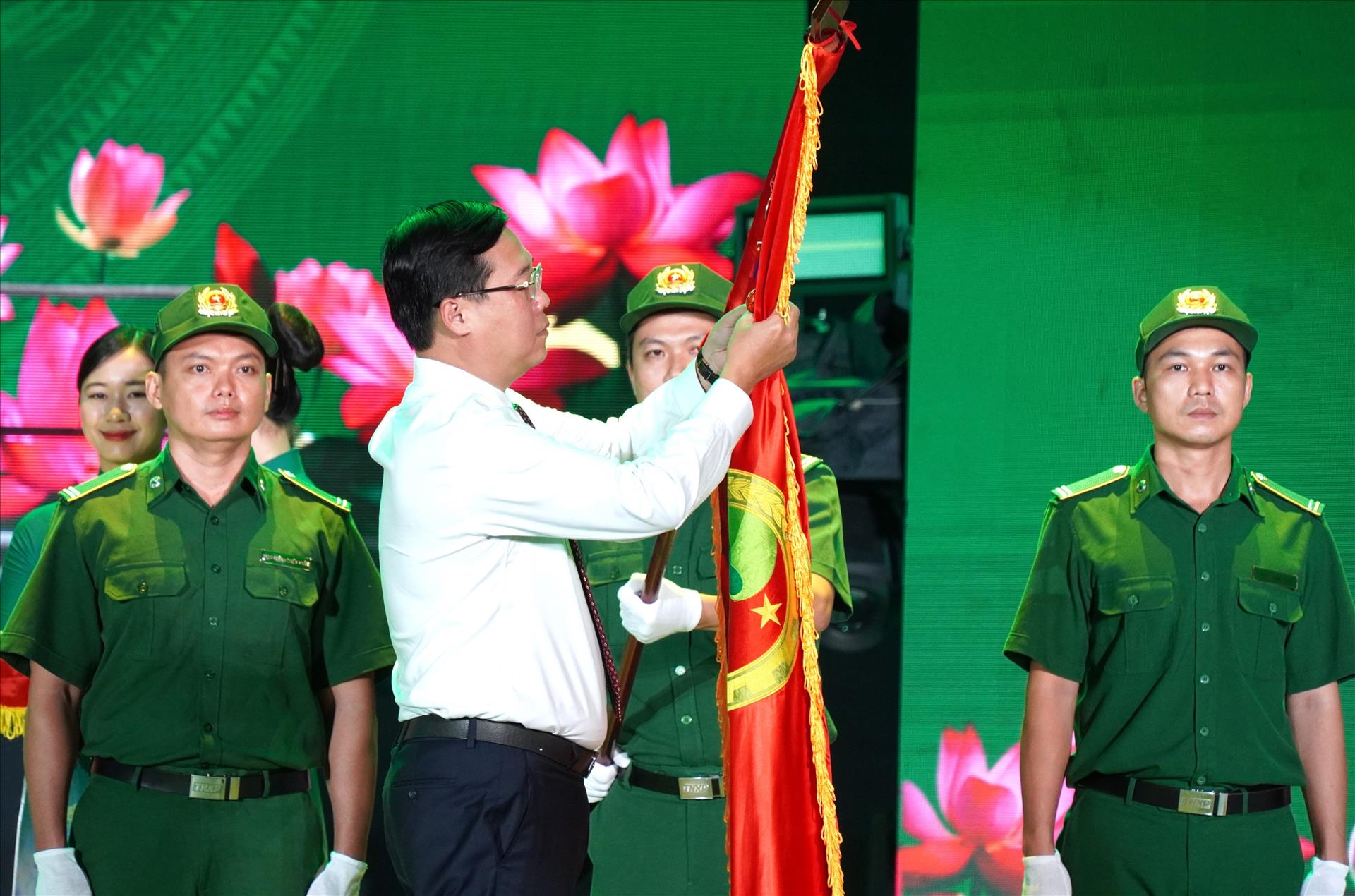 Ông Lê Quốc Phong, Phó Bí thư Thường trực Thành ủy TP. Hồ Chí Minh thừa Ủy quyền của Chủ tịch Nước gắn Huân Chương Lao động Hạng Nhất lên cờ truyền thống của Lực lượng Thanh niên xung phong Thành phố. Ảnh: Trung Tuyến - TTXVN