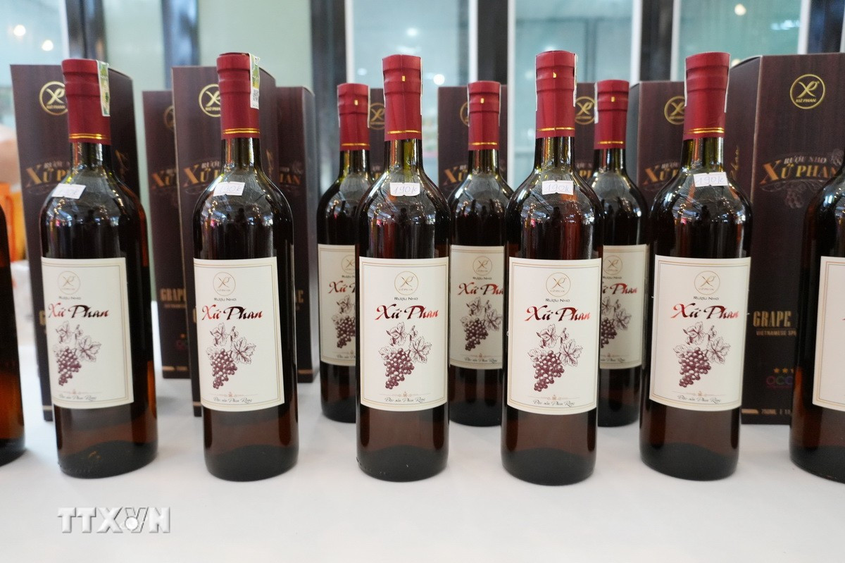 Sản phẩm rượu nho được giới thiệu tại một sự kiện quảng bá, kết nối tiêu thụ sản phẩm OCOP và đặc thù của địa phương do tỉnh Khánh Hòa tổ chức. Ảnh: Nguyễn Thành/TTXVN