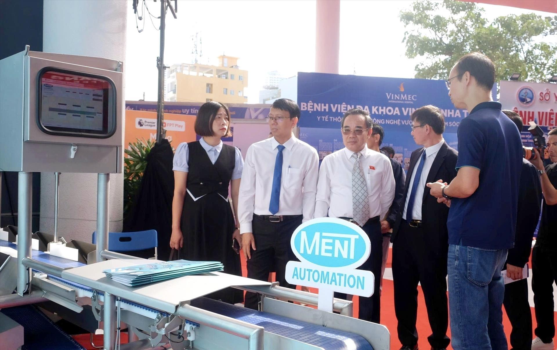 Các đại biểu, khách mời tham quan gian hàng trưng bày máy móc, giải pháp công nghệ mới tại sự kiện giới thiệu sản phẩm khoa học - công nghệ do tỉnh Khánh Hòa tổ chức. Ảnh: TTXVN phát