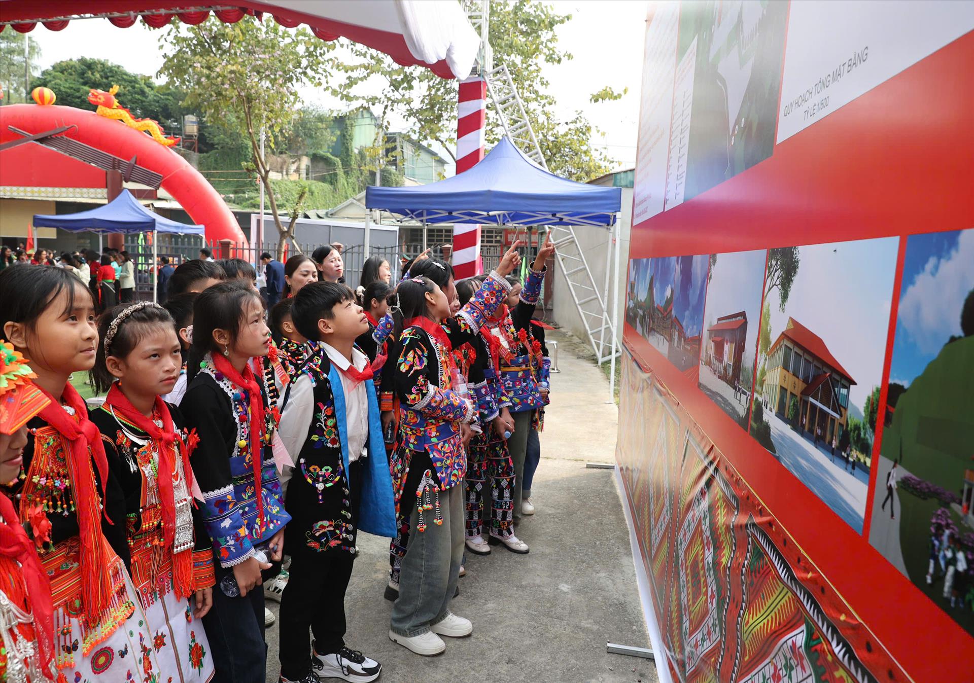 Các học sinh trong vùng xem bản thiết kế xây dựng các trường học.