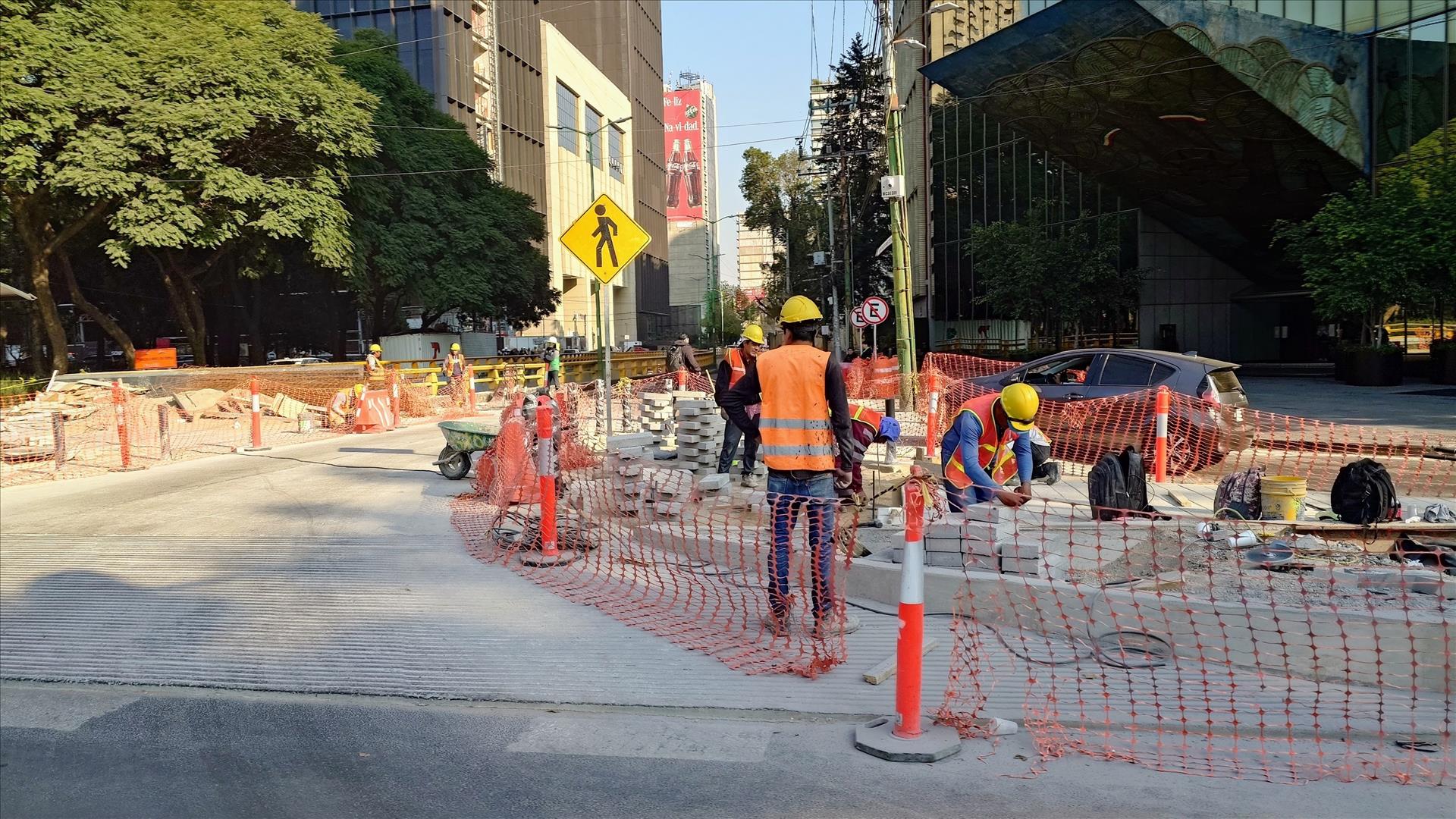 Công nhân thi công sửa đường giao thông tại trung tâm thủ đô Mexico City, Mexico. Ảnh: Phi Hùng - PV TTXVN tại Mexico