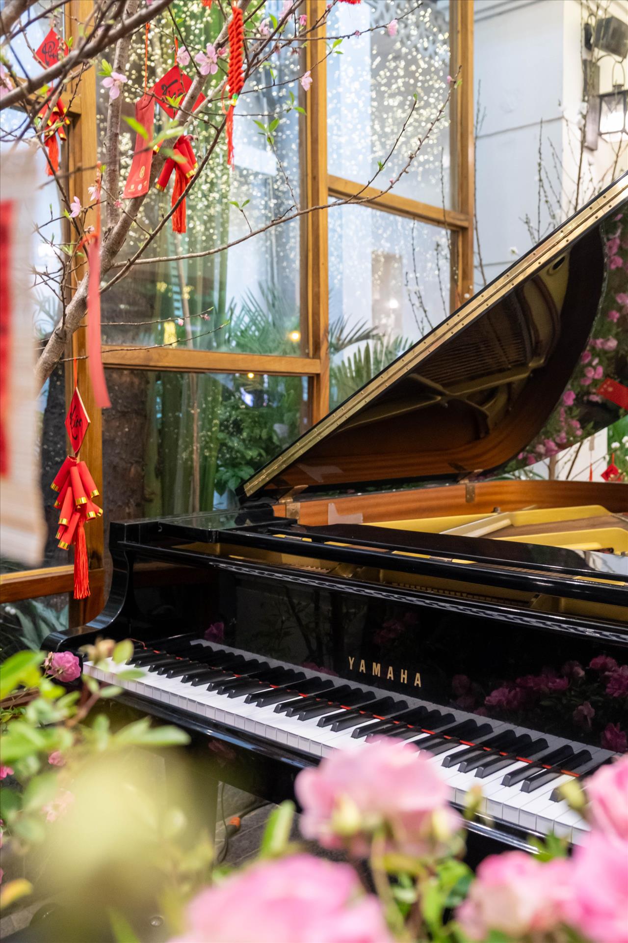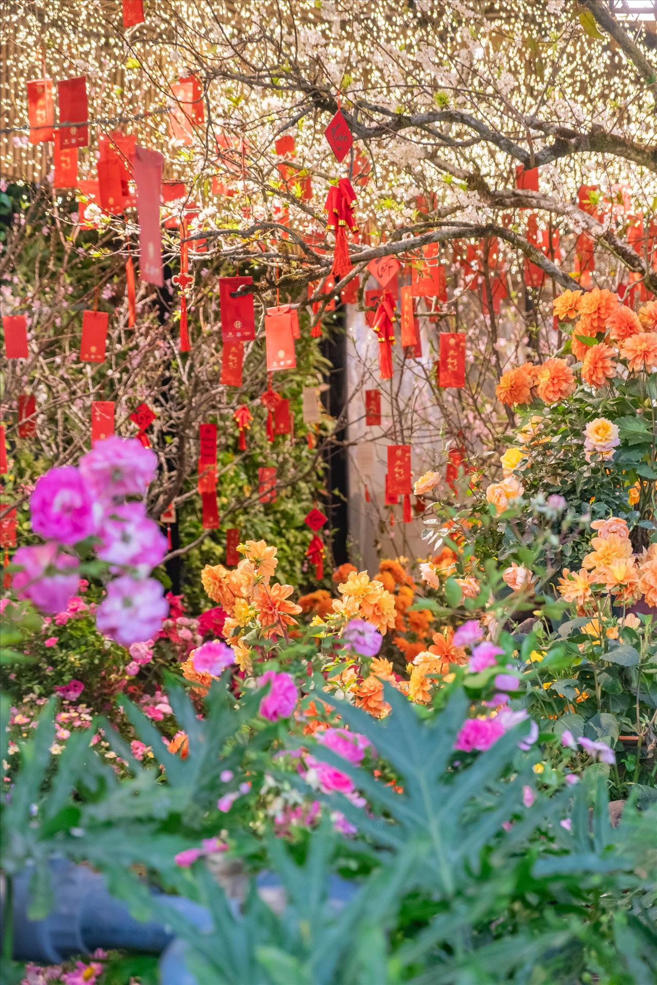 Không gian quán được chăm chút với các gam màu truyền thống của ngày Tết như đỏ, vàng, xanh lá, điểm xuyết những cành đào, tạo nên khung cảnh vừa ấm cúng vừa rộn ràng không khí xuân. Mỗi góc nhỏ tại Ngon Garden đều trở thành điểm check-in được nhiều thực khách yêu thích trong những ngày cuối năm.
