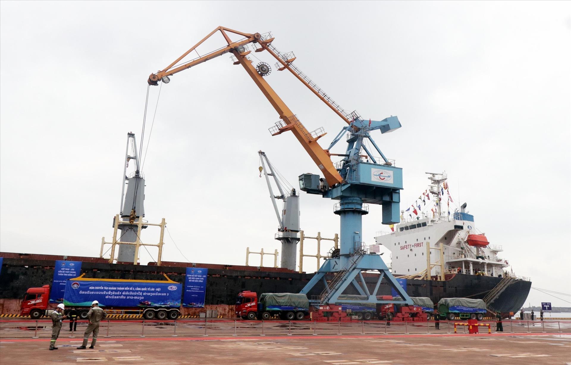 Tàu vào lấy hàng ở bến cảng thuộc Công ty Cổ phần Cảng Quốc tế Lào - Việt. Ảnh: Công Tường/TTXVN