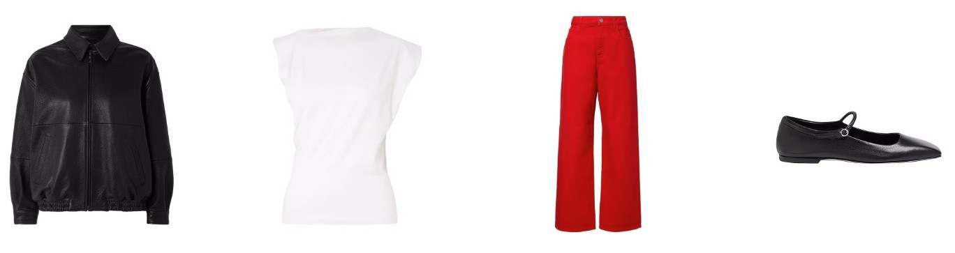 Quần jeans đỏ vốn dĩ đã là điểm nhấn ấn tượng, nên việc phối trang phục đơn giản sẽ mang lại hiệu quả tối ưu. Bạn có thể kết hợp với áo thun trắng cơ bản hoặc một chiếc áo lệch vai độc đáo, thêm vào đó là áo khoác bomber da màu đen để tạo nên phong cách tự tin và tinh tế.