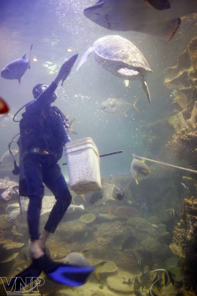 Anh Lê Văn Long, chuyên viên chăm sóc cá tại Thuỷ cung Vinpearl cho biết: "Hiện tại, Thuỷ cung Vinpearl có 17 nhân viên chuyên theo dõi và chăm sóc cá. Công việc của chúng tôi là cho cá ăn, cho cá uống thuốc khi chúng trái gió trở trời, đảm bảo làm sao cho cá khoẻ mạnh và luôn đẹp trong lòng thuỷ cung. Để làm được những công việc tưởng như đơn giản này đòi hỏi chúng tôi phải hiểu đặc tính của từng loài cá, chăm sóc cá một cách tận tâm mới giữ được cá sống lâu...".