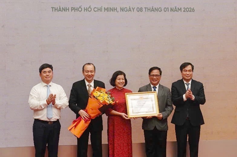 Công ty TNHH Đường sách Thành phố Hồ Chí Minh nhận Bằng khen của Ban Tuyên giáo và Dân vận Trung ương vì đã có thành tích xuất sắc trong công tác tuyên truyền, đóng góp cho sự nghiệp phát triển xuất bản và văn hóa đọc. Ảnh: Thu Hương - TTXVN