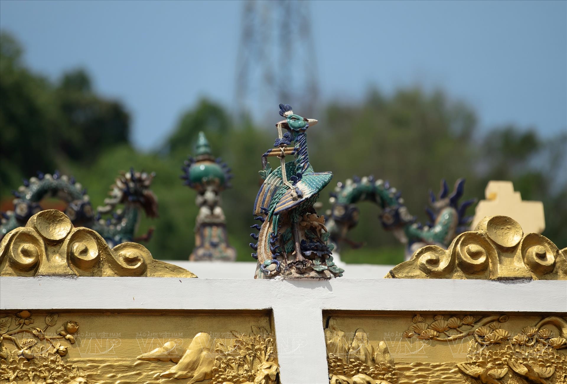 Trên mái đền thờ chính Lăng ông Thoại Ngọc Hầu, họa tiết trang trí gốm men với hình tượng linh vật được tạo tác tinh xảo, nổi bật trên nền kiến trúc cổ kính, góp phần tôn lên vẻ uy nghiêm và giá trị thẩm mỹ của công trình.