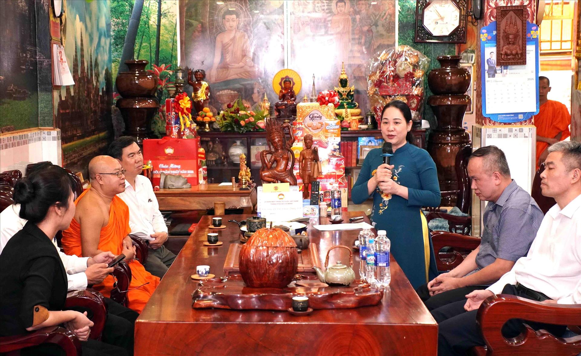 Bà Nông Thị Hà, Thứ trưởng Bộ Dân tộc và Tôn giáo thăm, tặng quà chúc Tết các chức sắc Phật giáo Nam Tông Khmer tại chùa Pothiwong, phường Bảy Hiền. Ảnh: Trung Tuyến-TTXVN
