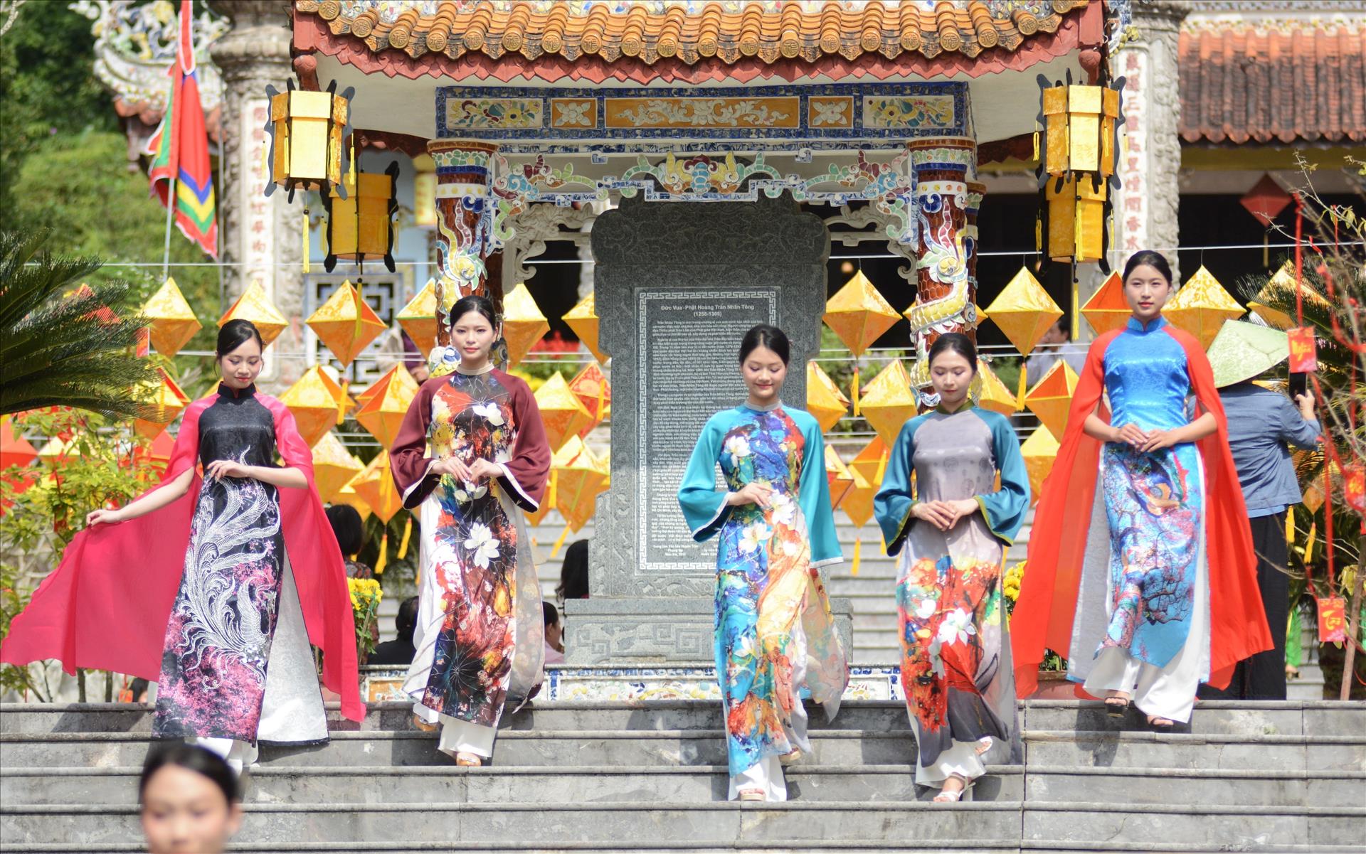 Chương trình trình diễn thời trang truyền thống tại Đền Huyền Trân. . Ảnh: Văn Dũng-TTXVN