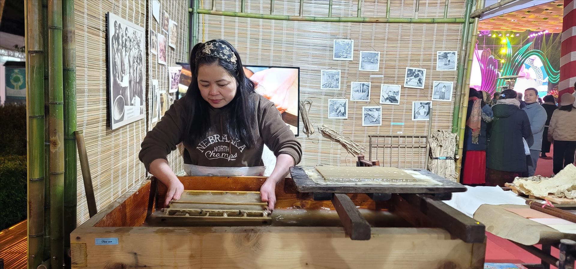 Trình diễn nghề làm giấy dó tại Lễ hội hoa đào, quất cảnh và sản phẩm OCOP các vùng miền Xuân Giáp Thìn 2024. Ảnh: Phương Anh-TTXVN