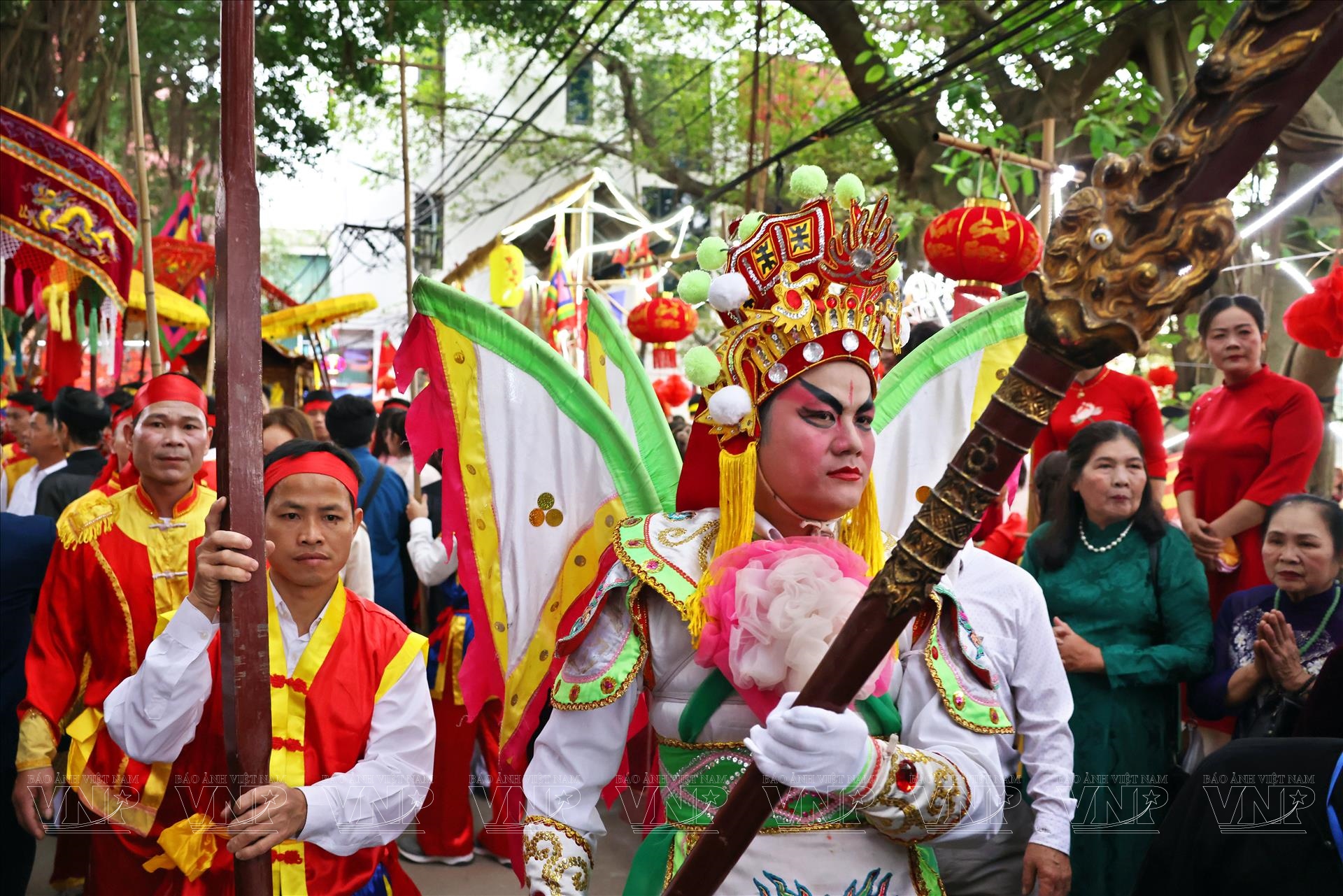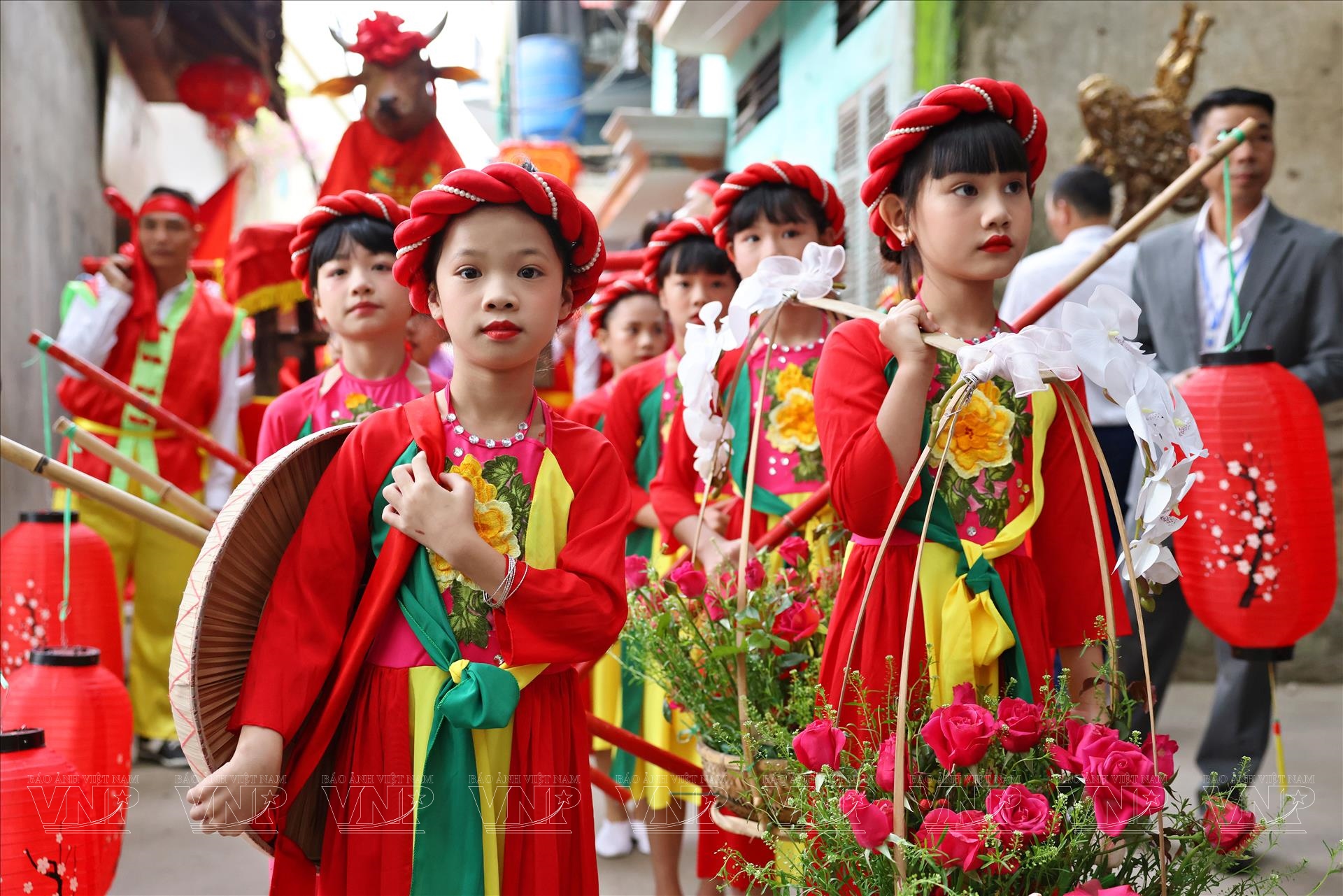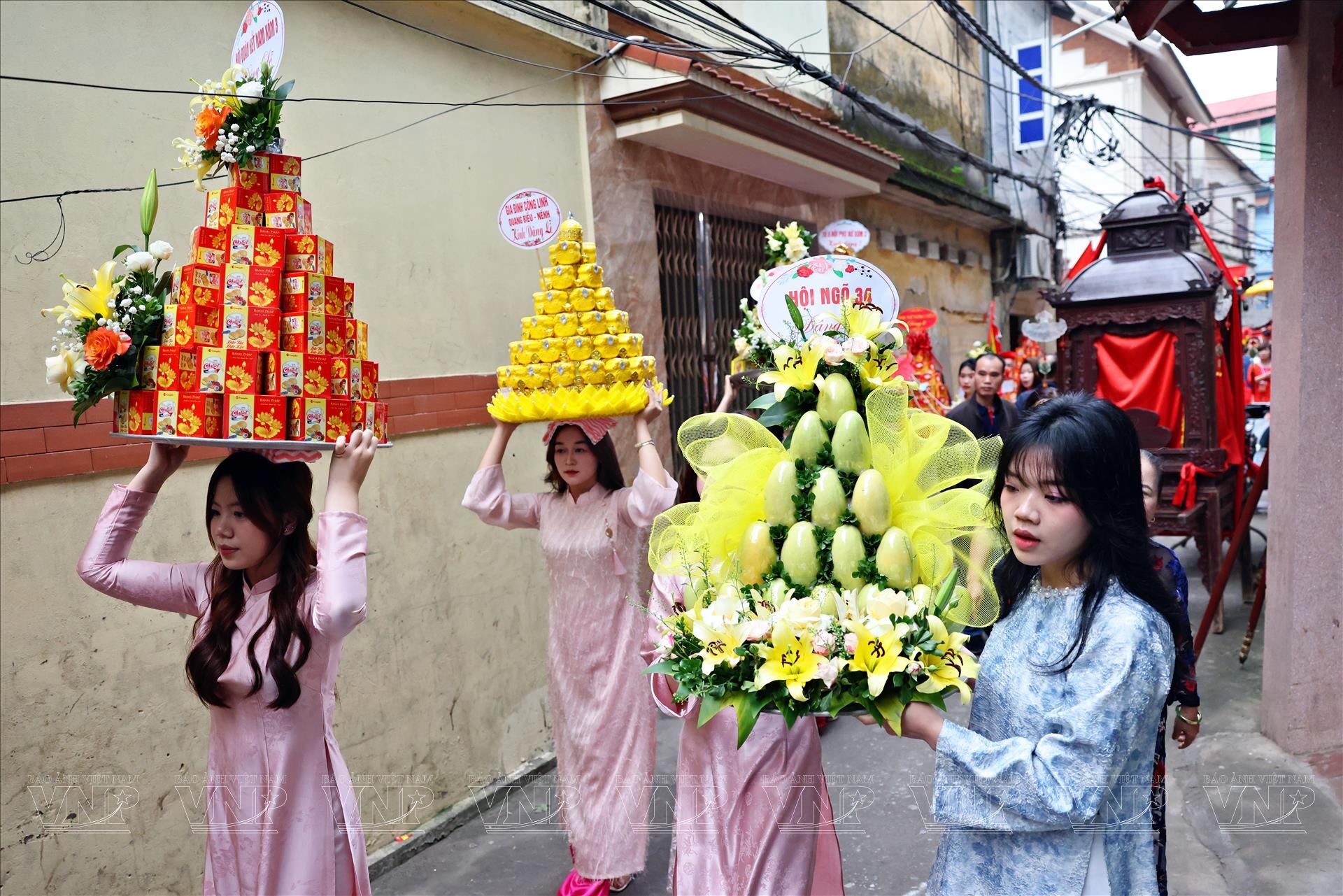 Khung cảnh lễ rước càng trở nên sinh động khi các đoàn người mặc áo the, khăn xếp, áo dài truyền thống sải bước trong nhịp trống rộn ràng. Những lá cờ hội tung bay trong gió xuân, xen giữa những bức tường gạch đỏ và mái ngói cổ kính của làng gốm xưa, tạo nên bức tranh lễ hội đậm chất văn hóa Kinh Bắc.