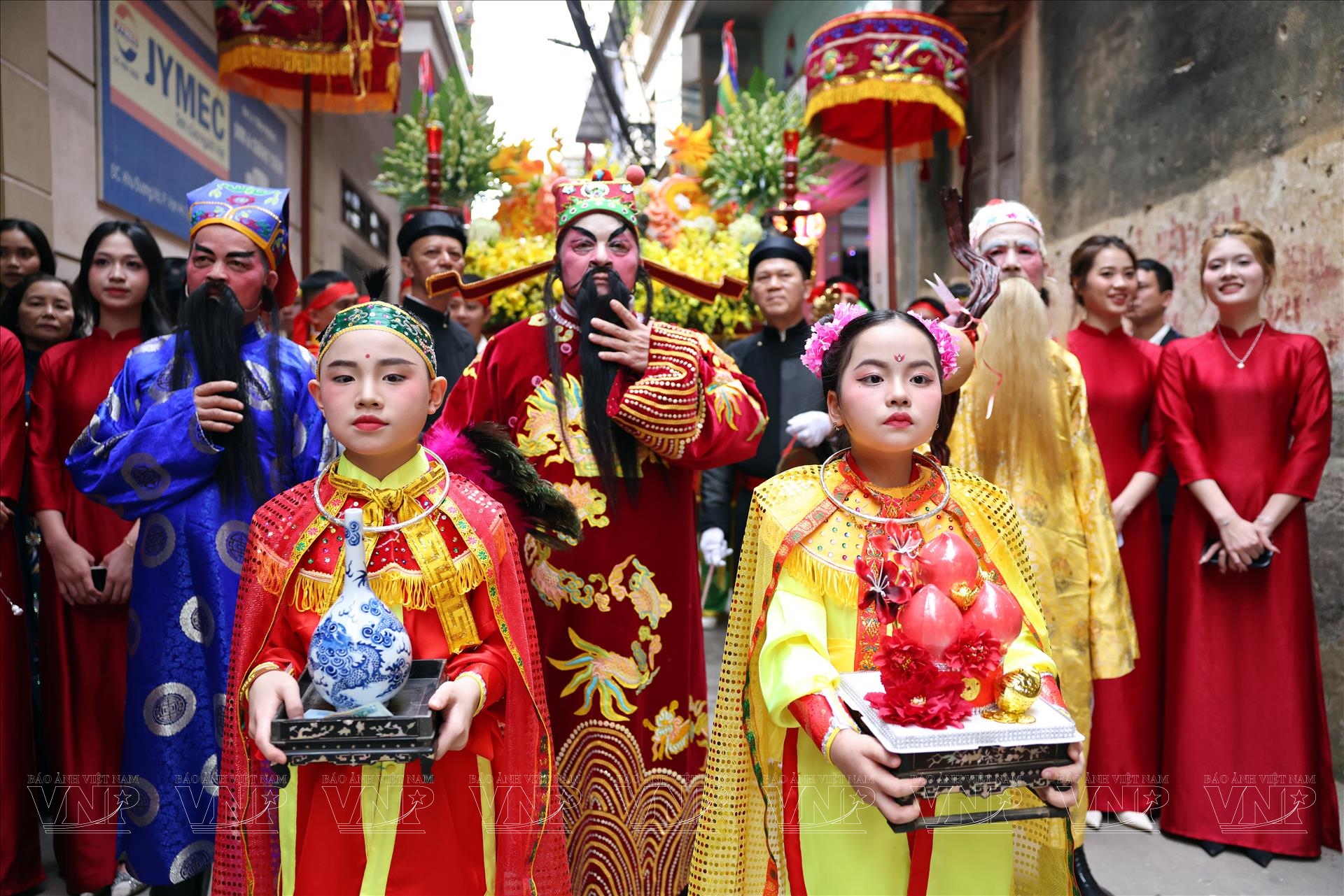 Sau nghi thức dâng hương trong đình, đoàn rước kiệu bắt đầu xuất phát trong tiếng trống, tiếng chiêng và lời xướng trang nghiêm. Đoàn rước gồm các bô lão, đội tế nam quan - nữ quan, đội cờ, đội trống cùng đông đảo người dân địa phương. Những chiếc kiệu sơn son thếp vàng được khiêng đi chậm rãi qua các con ngõ cổ của làng, thu hút đông đảo người dân đứng hai bên đường theo dõi và chắp tay thành kính.