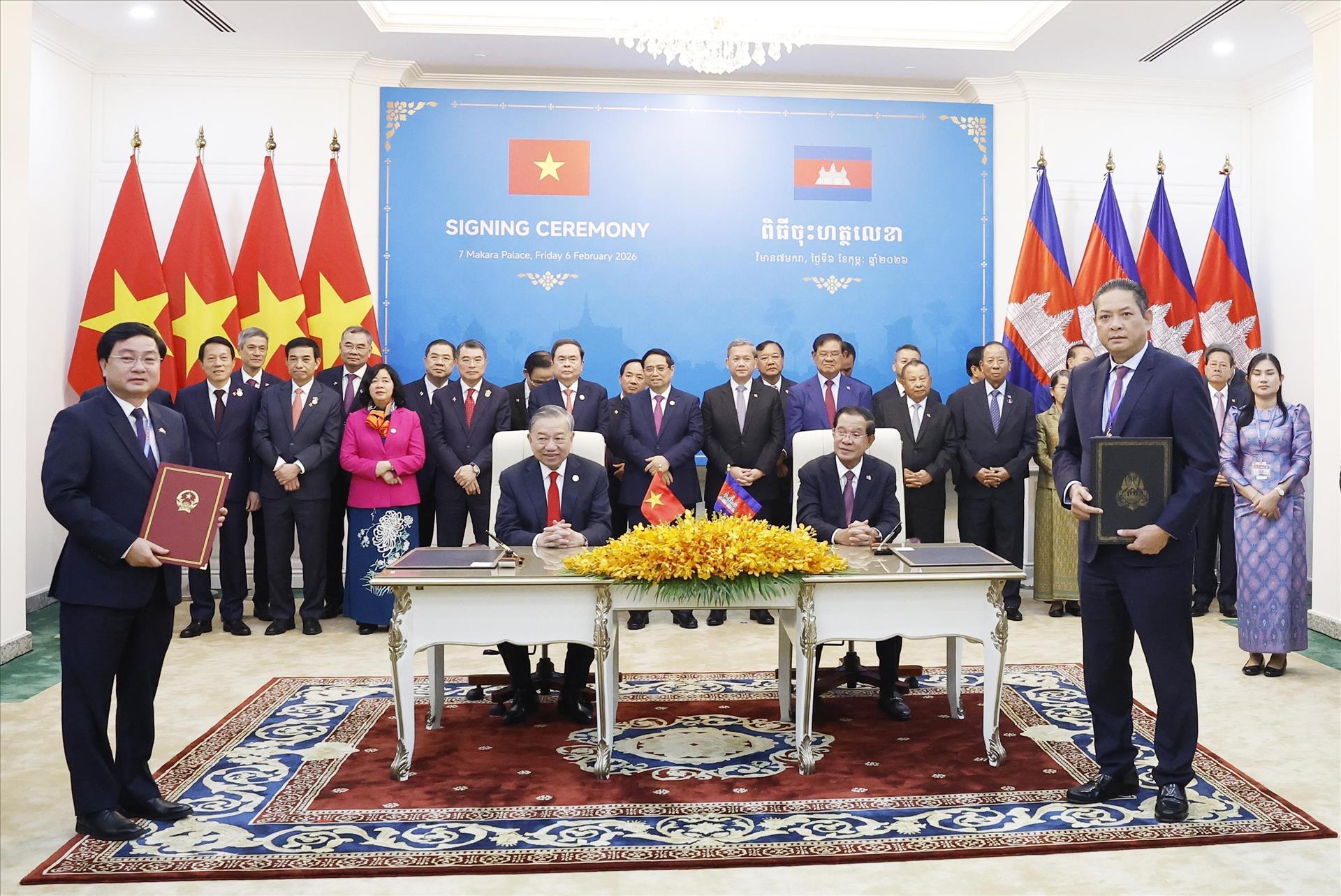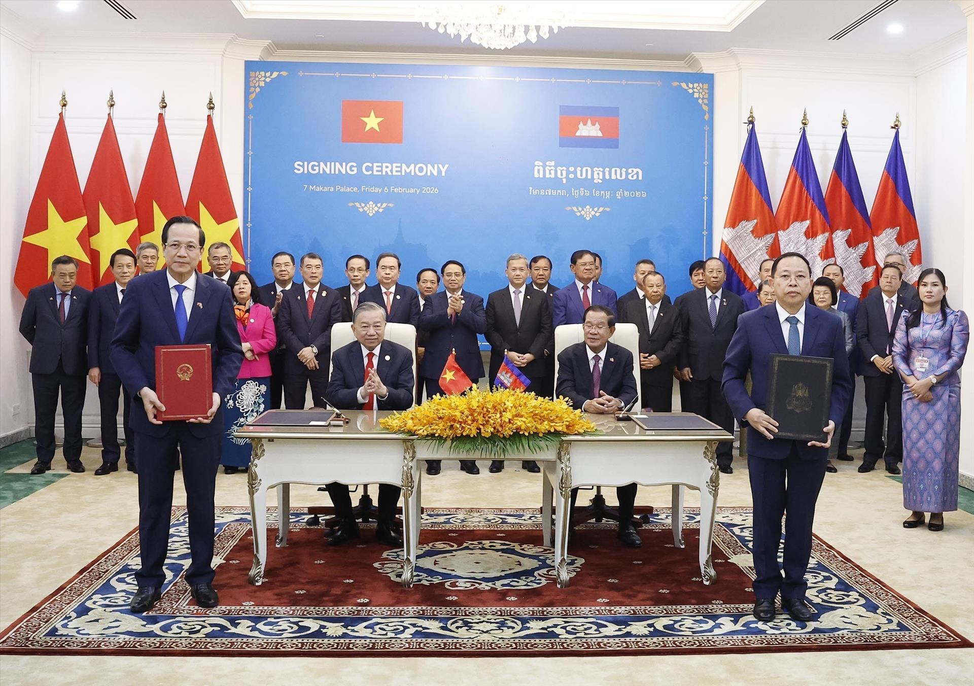 Sáng 6/2/2026, tại Thủ đô Phnom Penh, Tổng Bí thư Tô Lâm và Chủ tịch Đảng Nhân dân Campuchia Samdech Techo Hun Sen chứng kiến lễ ký các văn kiện hợp tác giữa hai nước. Ảnh: Thống Nhất – TTXVN