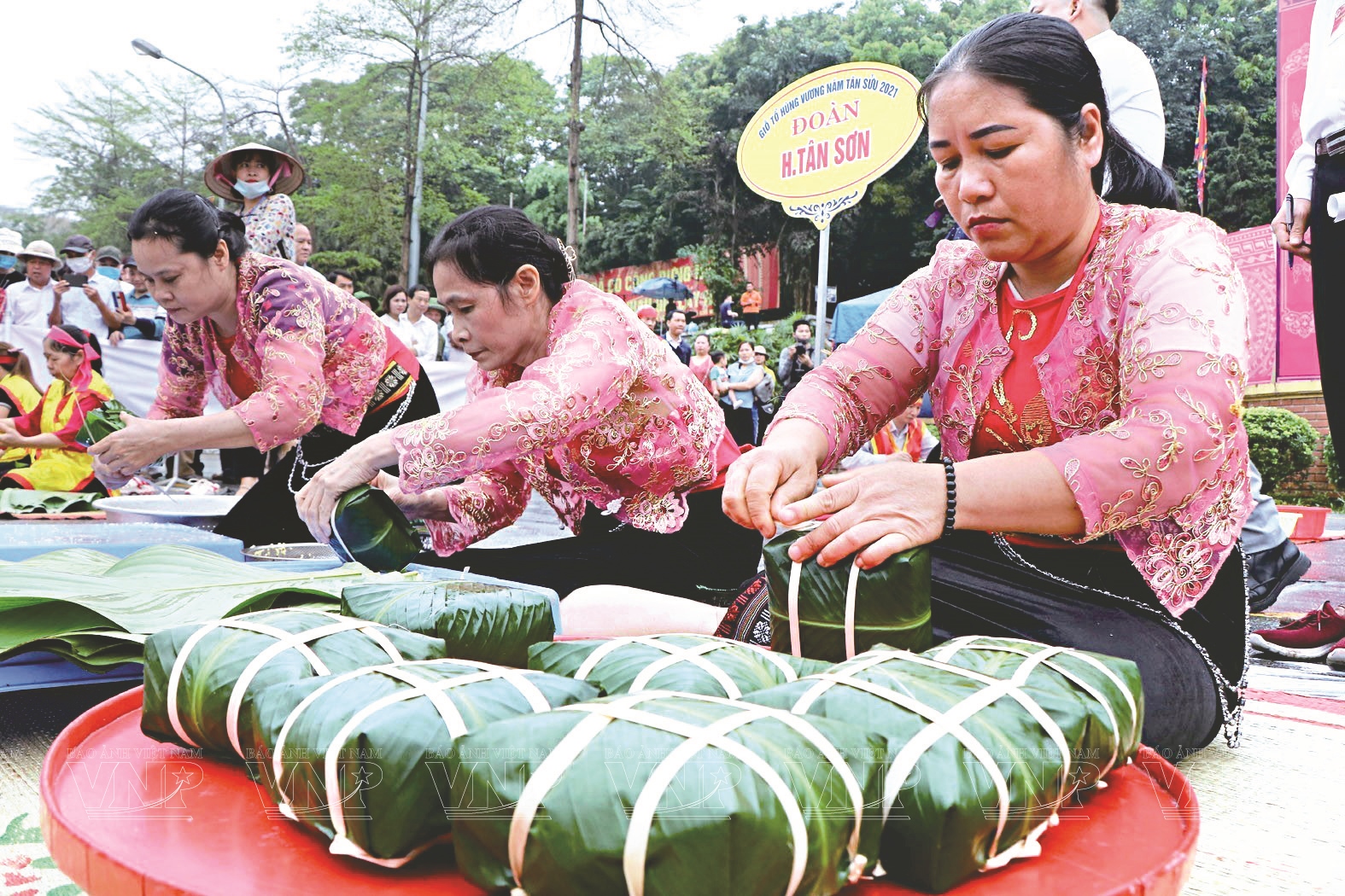 Trong mâm cơm giỗ Tổ Hùng Vương không thể thiếu bánh chưng, bánh giày . Ảnh: TTXVN