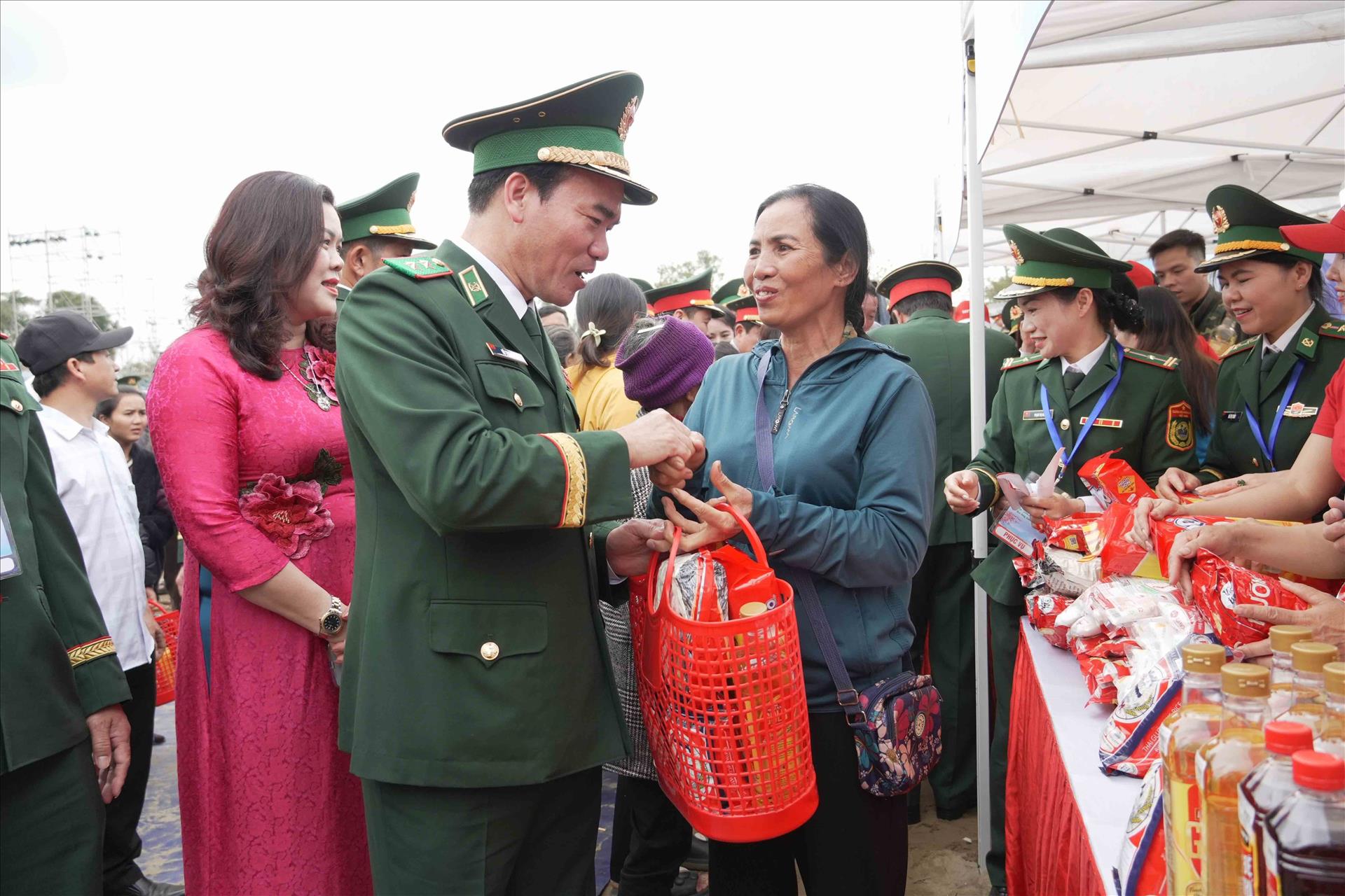 Đại biểu Bộ Tư lệnh Bộ đội Biên phòng trao quà từ gian hàng 0 đồng cho người dân. Ảnh: Hữu Quyết - TTXVN