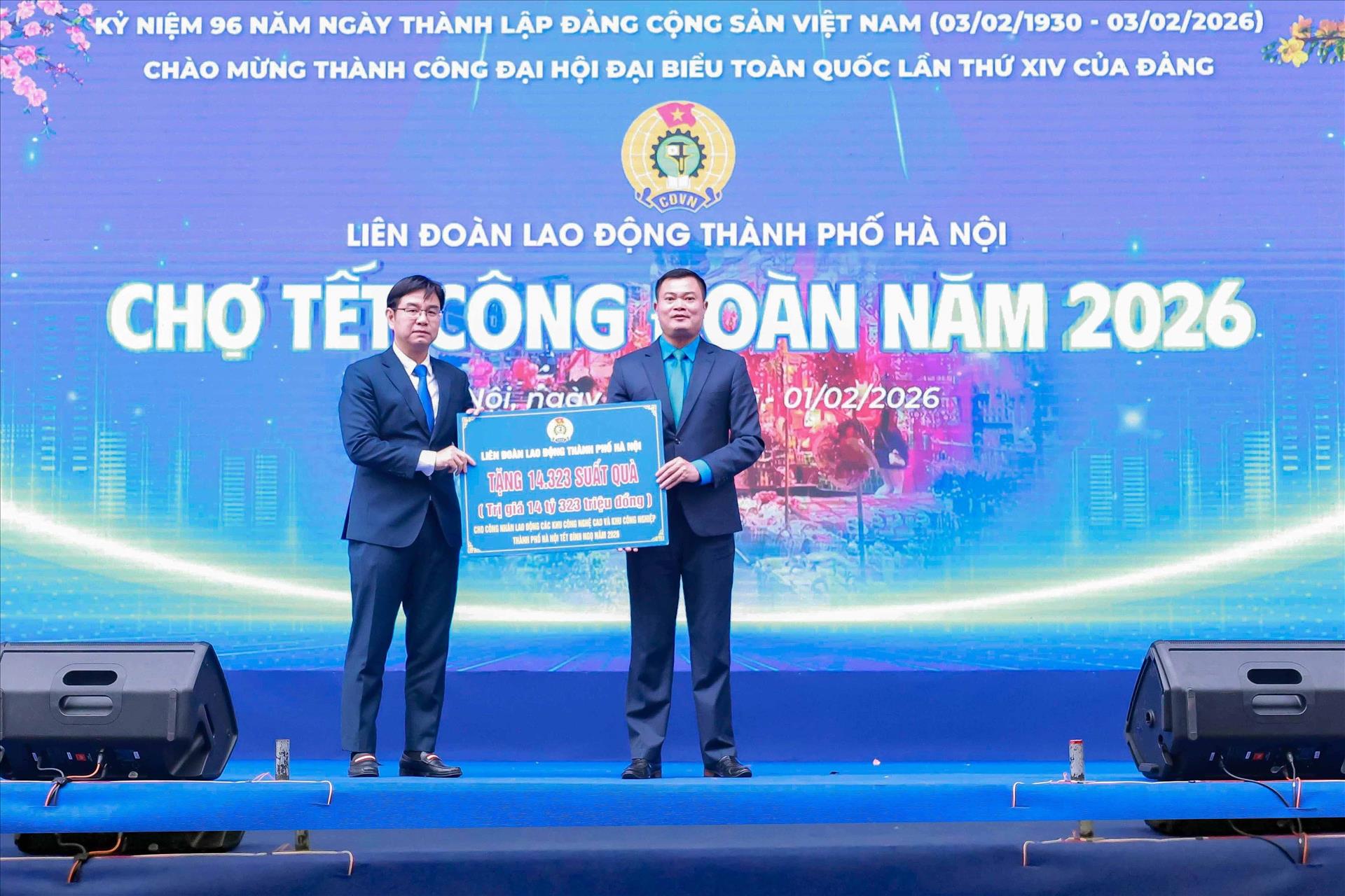 Lãnh đạo Liên đoàn Lao động thành phố Hà Nội trao biển hỗ trợ cho công nhân lao động có hoàn cảnh khó khăn dịp Tết Bính Ngọ 2026. Ảnh: Minh Nghĩa – TTXVN