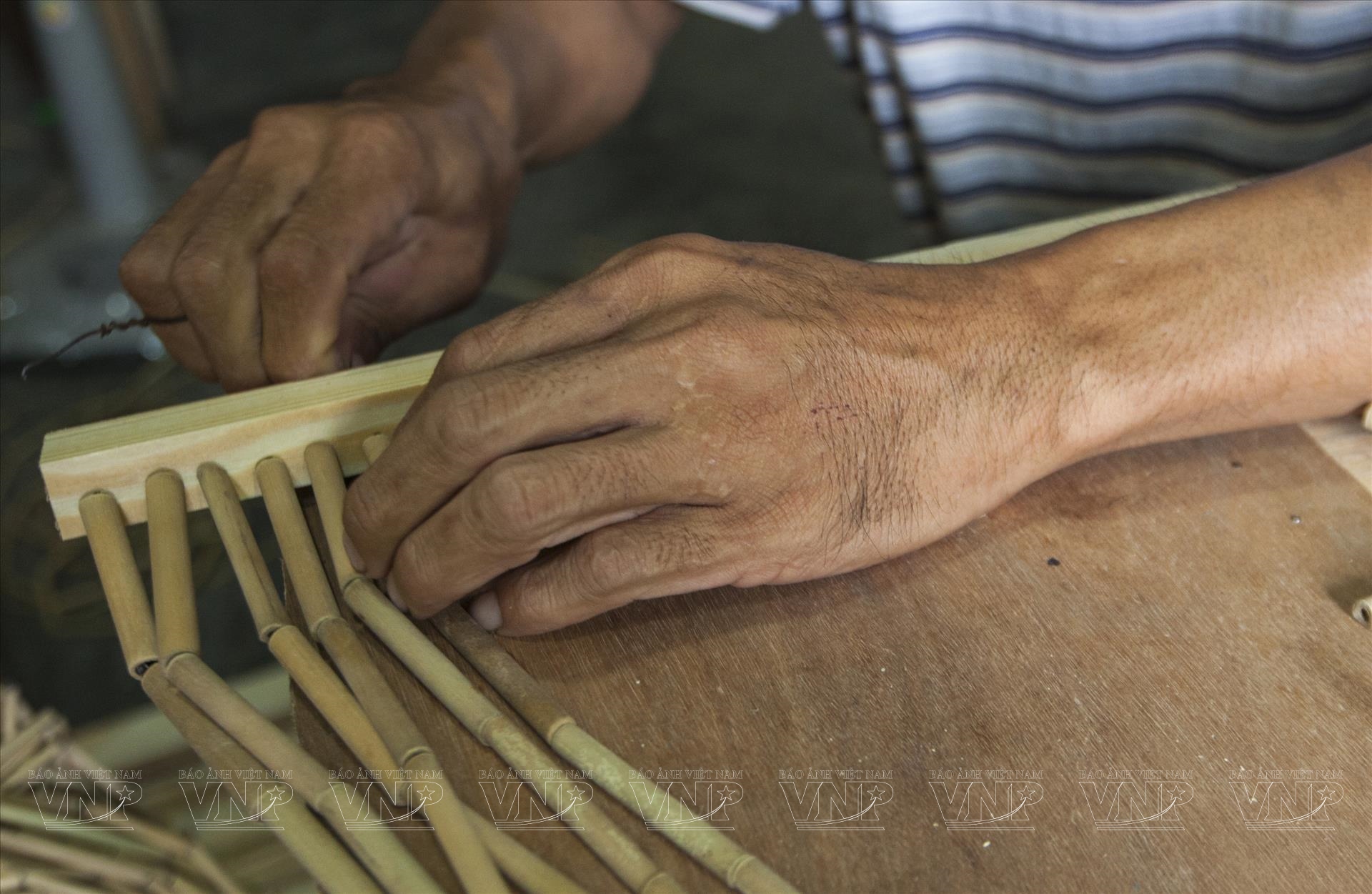 Sau khi xâu lại với nhau thành mành trúc sẽ được treo lên giá để trang trí họa tiết, hoa văn cho mành trúc.