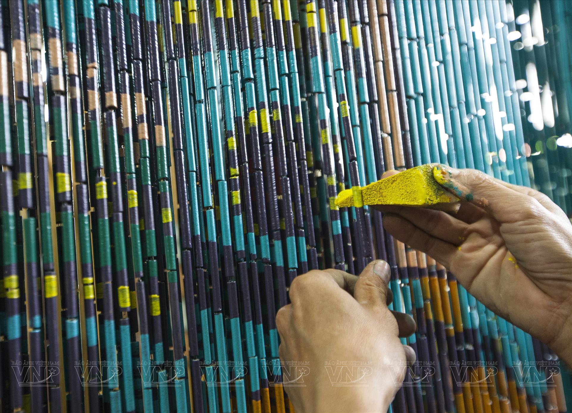 Sơn mành trúc không cần dùng cọ hay bút màu vẽ, người thợ chỉ dùng một miếng xốp thấm sơn và biểu thị chi tiết trang trí lên mành trúc.