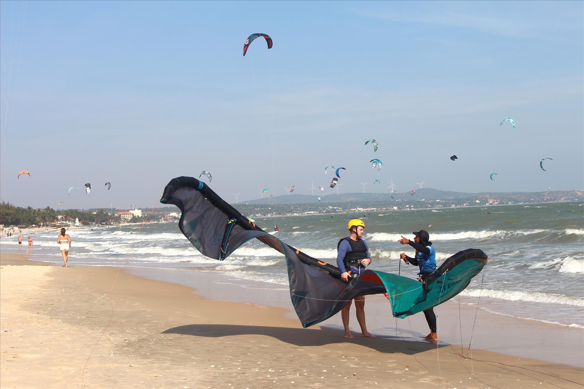 Dọc bờ biển Hàm Tiến-Mũi Né mùa này luôn rộn ràng từ trưa đến cuối buổi chiều. Trên bãi cát trắng trải dài, những người chơi chuẩn bị diều, kiểm tra dây, trao đổi nhanh với huấn luyện viên trước khi lao ra biển.