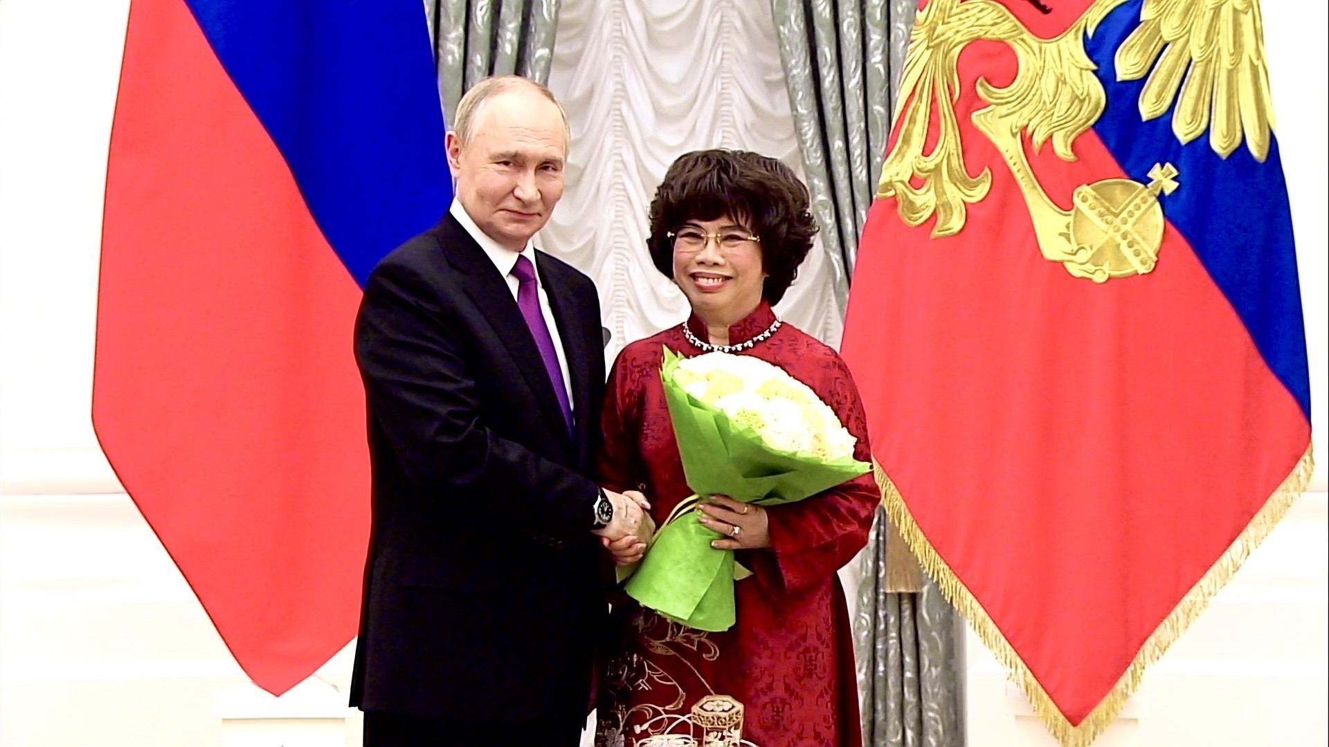 Tổng thống Vladimir Putin đích thân gắn Huân chương Hữu nghị cho Anh hùng Lao động Thái Hương. Ảnh: Tâm Hằng - PV TTXVN tại Liên bang Nga